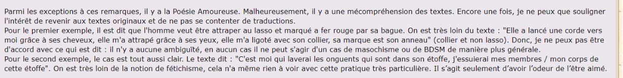 Paheqamen,l e samouraï de ddchampo enchaîne : « il est dit que l’homme veut être attrapé au lasso (…) On est très loin du texte… ». Il manifeste également son désaccord sur la traduction « elle m’a ligoté avec son collier… » et précise « collier et non lasso ».
