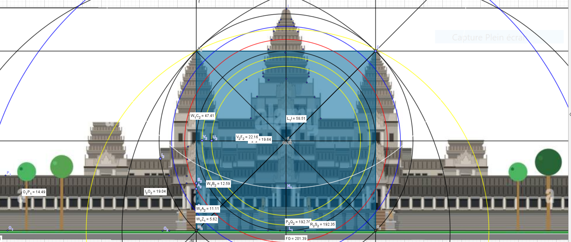 Prenons les hauteurs, la cinquième centrale, fait 58.5 mètres( Sur kle dessin)...c'est 47.3/1.618=29.233 m