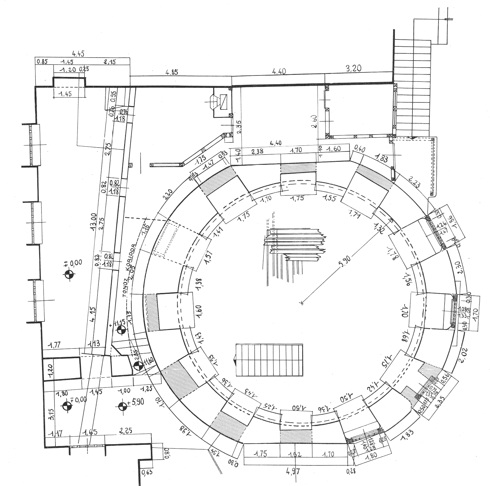 Reporté sur le plan la moitié gauche du cercle extérieur est différente de sa moitié droite, on perçoit nettement l'épaisseur des murs à droite plus faible, suffit de regarder les mesures.