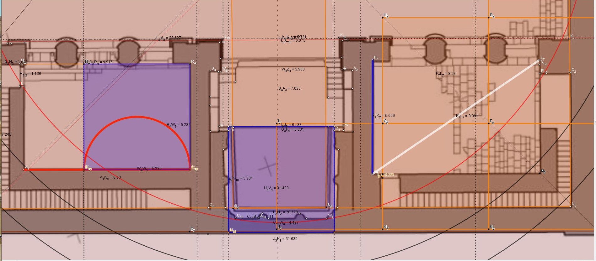 Nous reviendrons avec une explication plus complète plus tard, mais on peut déjà dire qu'un carré prend naissance par les axes des colonnes qui fait lui 100 meh remen de côté, ce qui montre la connaissance parfaite du maitre d'oeuvre des gestes des scribes des formes et des contours Egyptiens.