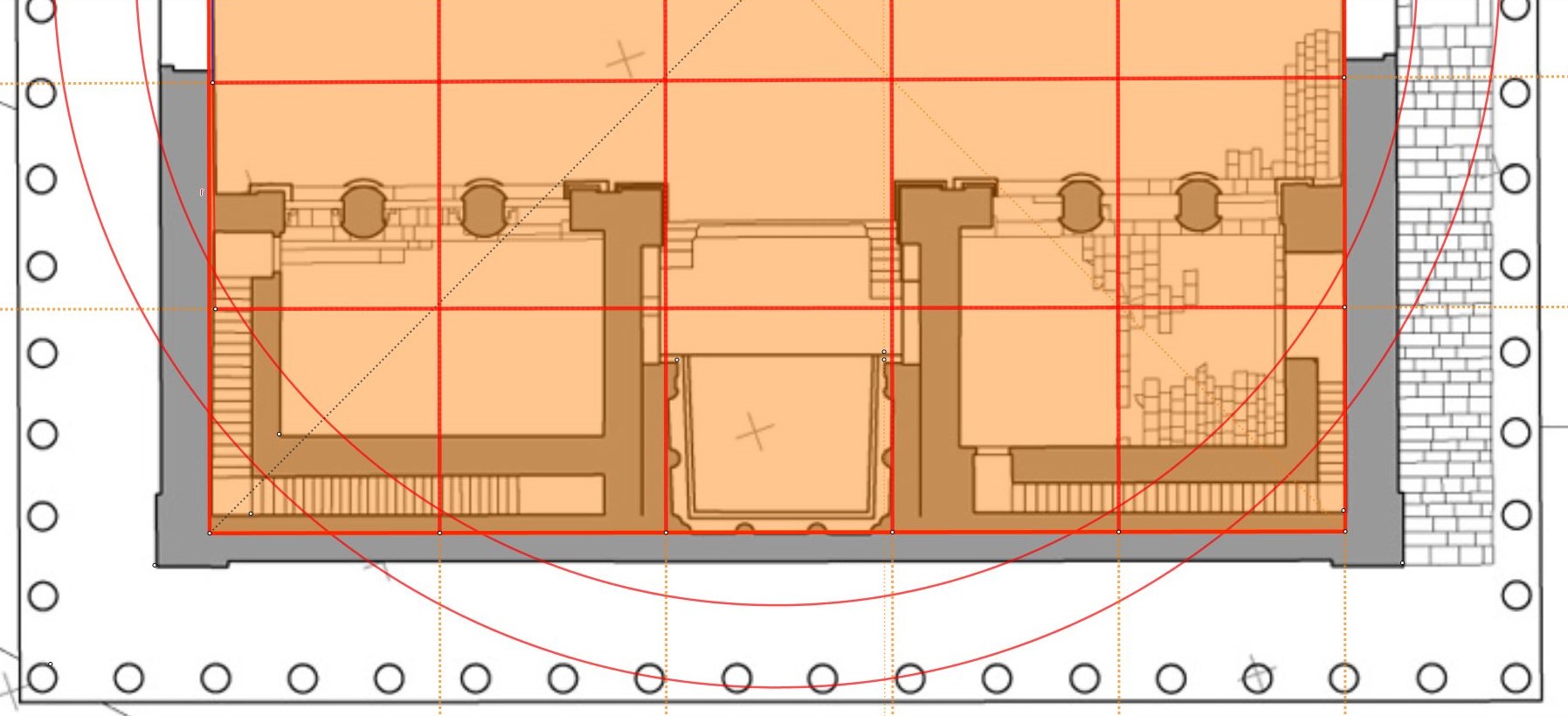 Toujours centré par les diagonales du carré que forment le contour externe des murs du temple, ici la ligne intérieure des colonnes tout autour du temple témoigne de la présence d'une surface Remen, autre mesure de surface Egyptienne.
