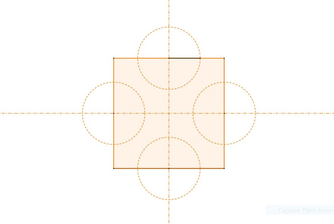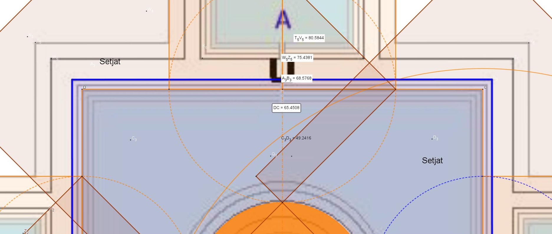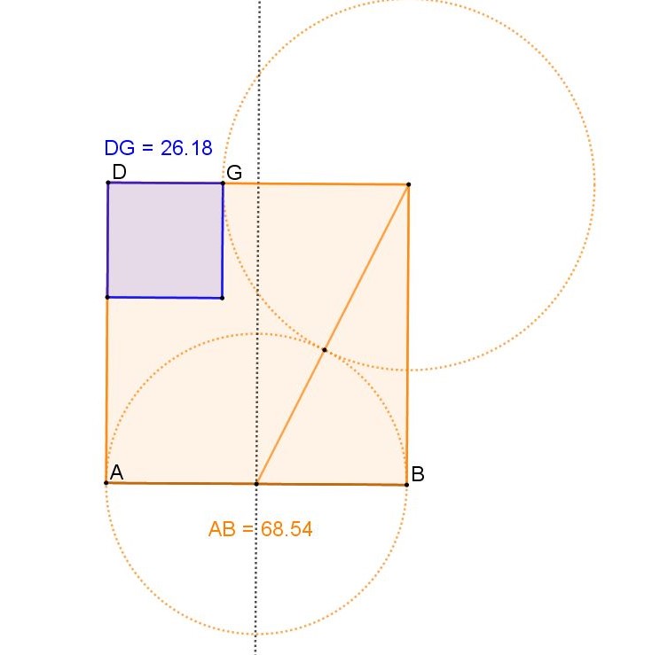 S'il fait bien 68.54 mètres, le reste après le tracé des deux cercles qui détermine sur le côté du carré une proportion de Phi carré et 1, soit un 68.54 mètres et 26.18 mètres dans la même proportion du nombre d'or au carré et de l'unité.