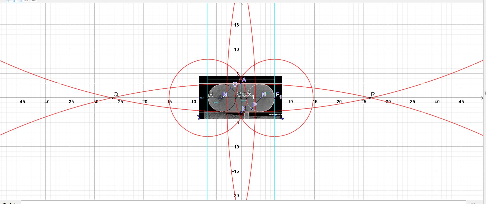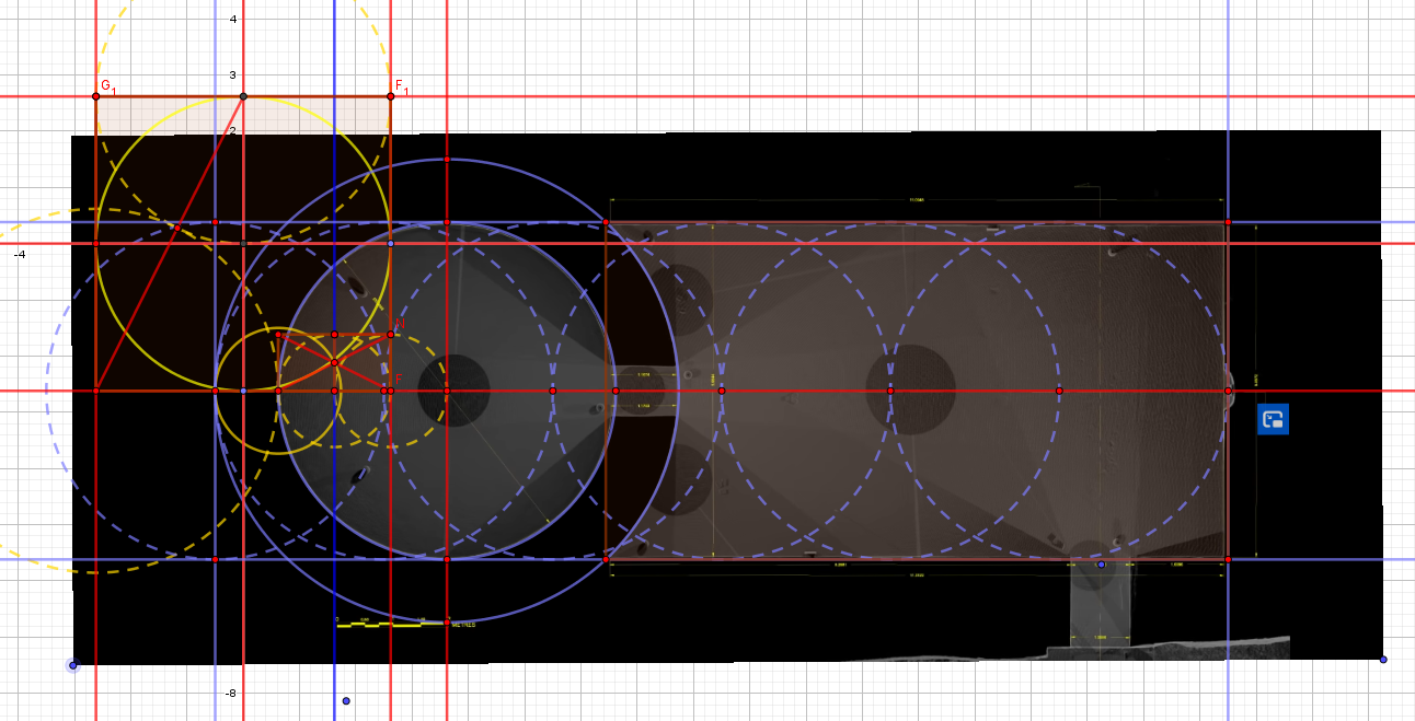 J'ai alligné l'image sous geogébra, avec précision, que j'ai agrandi au maximum pour la mettre en accord avec la largeur à 5.85 m. L'épaisseur blanche de la photos au laser, qu'on avait sur le plan précédent, correspondait à la pente du mur de 87°, comme l'indique l'équipe de BAM, et qu'on peut percevoir sur l'élévation.