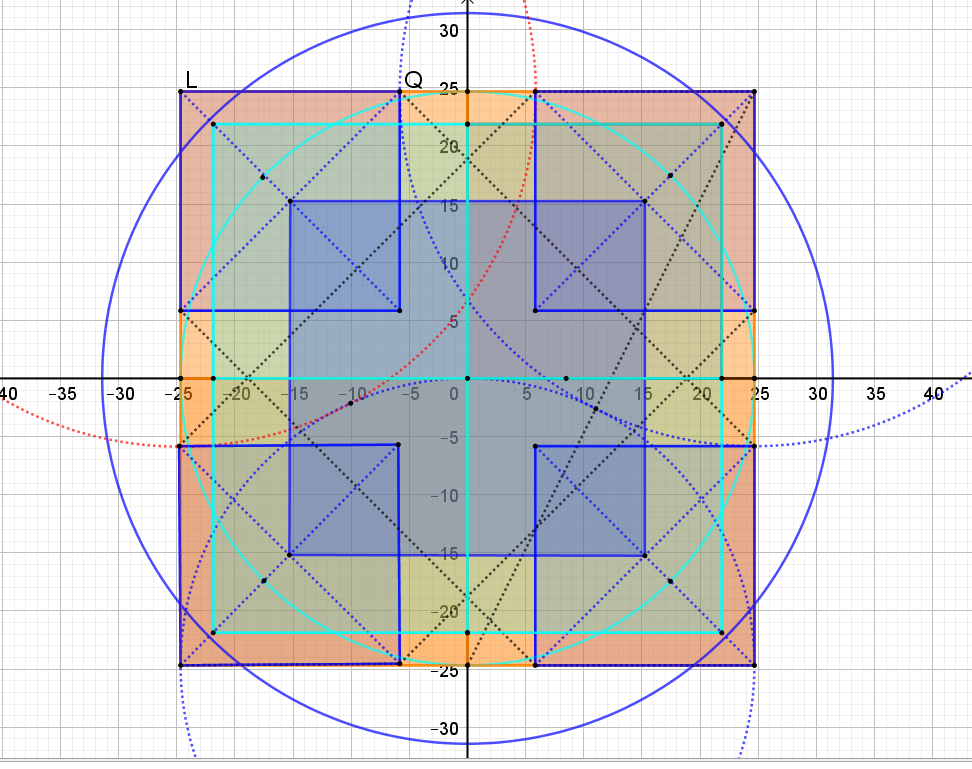 Le grand cercle violet est en quadrature périmétrique avec le grand carré formé par les quatre carrés oranges.