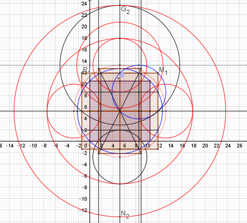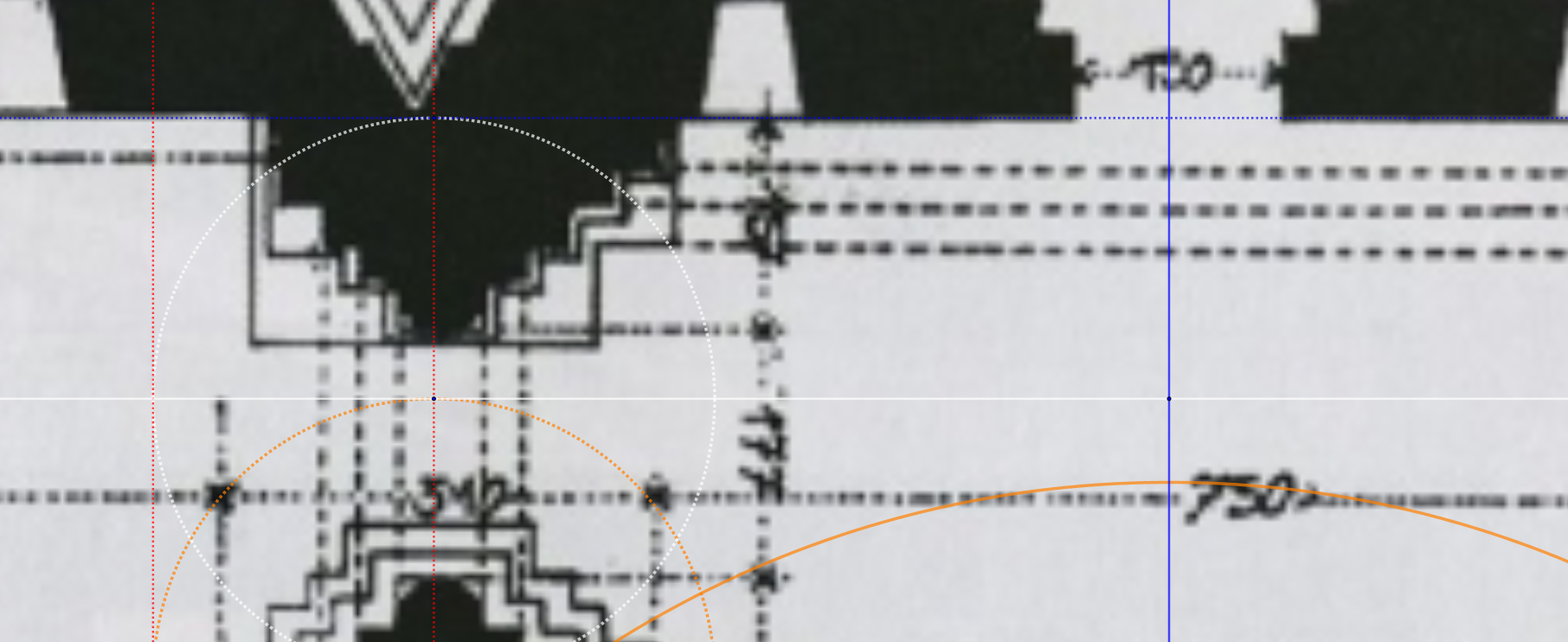 En bleu, le grand cercle determine donc la largeur de l'édifice, il a pour diamètre la distance donnée par 20 modules surface !