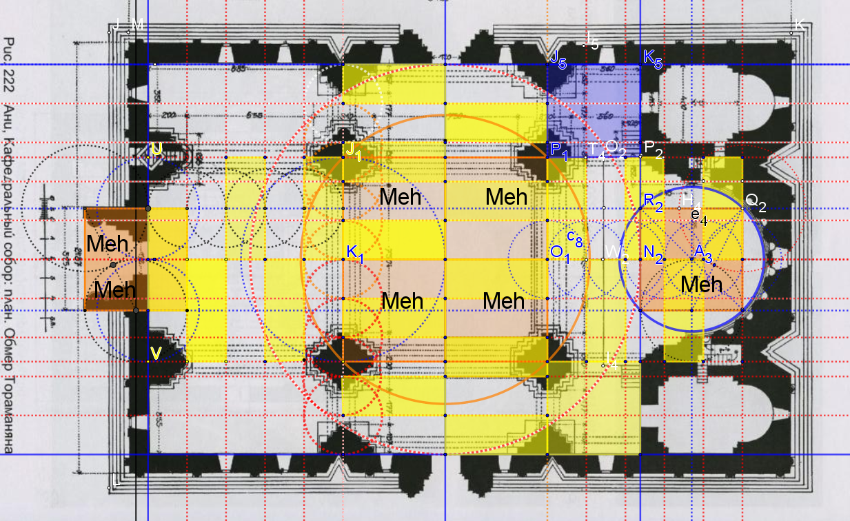 Ce cercle bleu s'inscrit dans un carré de quatre Meh de surface, c'est le transept qui d'ailleurs s'inscrit dans un cercle ici visualisé qui n'est autre que le socle de la Tholos de Delphes