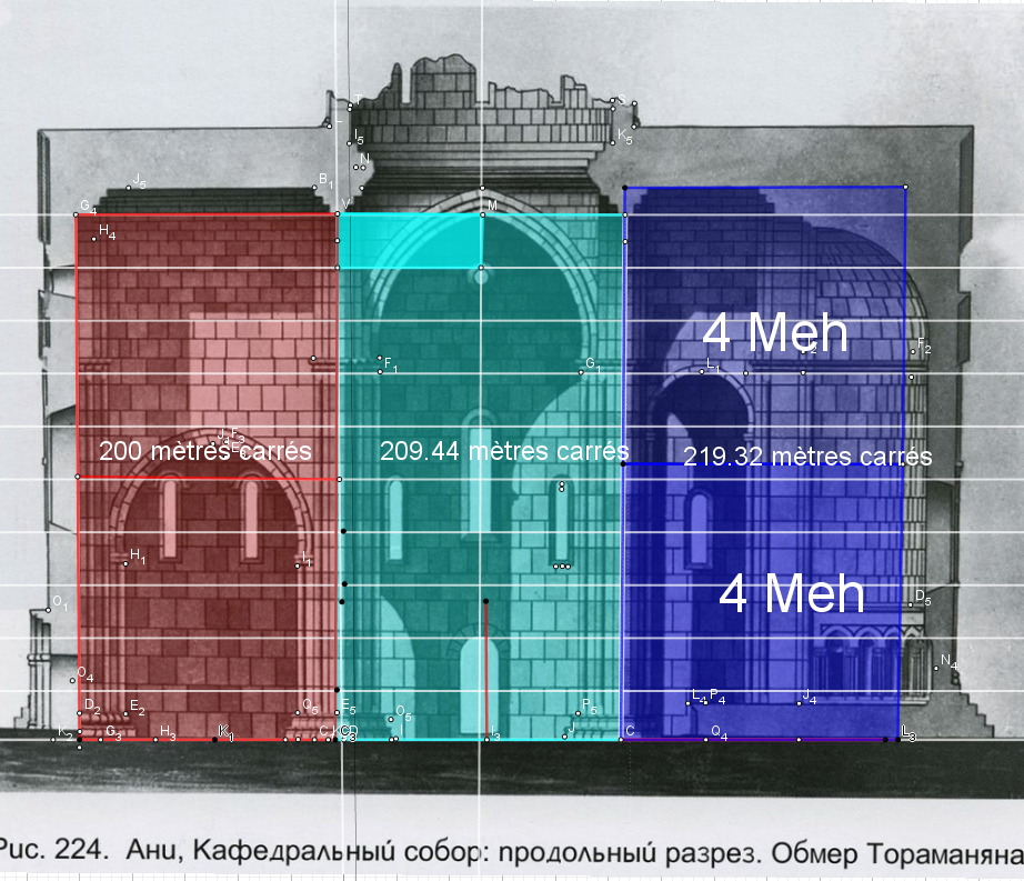 4 mètres largeur de la chapelle Nord de Sainte Mère-de-Dieu, unité en rapport avec les centres des piliers du transept, distants de Phi carré, 10.472 mètres.