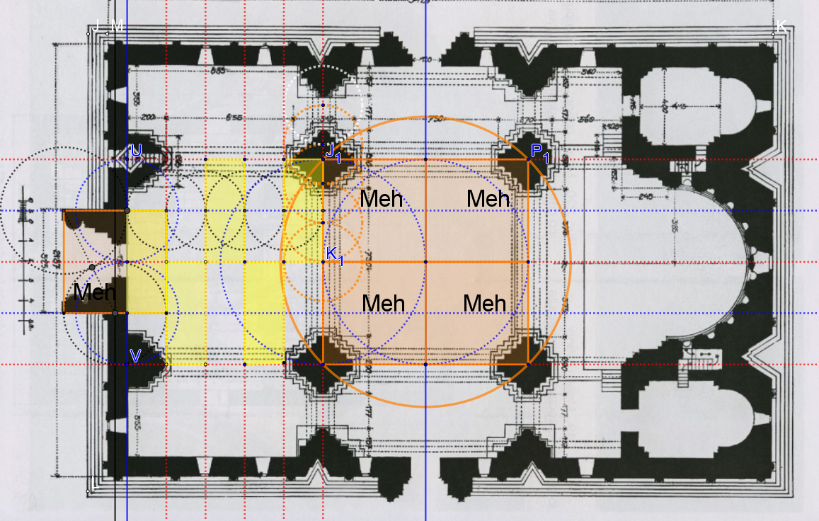 Ce cercle bleu s'inscrit dans un carré de quatre Meh de surface, c'est le transept qui d'ailleurs s'inscrit dans un cercle ici visualisé qui n'est autre que le socle de la Tholos de Delphes