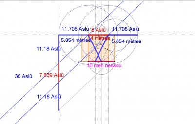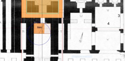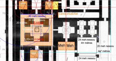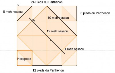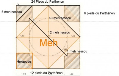Sur le schémas ci dessus Châhâr Tâq War Pil en traits noirs, les deux carrés oranges, double carrés, ont pour surface 2 Meh, le Meh étant une mesure de surface de l'ancienne Egypte, un carré de 10 meh nessou ( coudées royales) de côté.