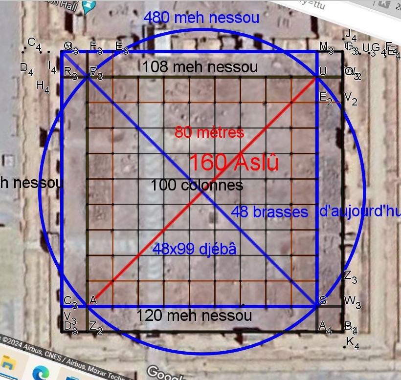 Nous avons glissé sous notre tracé modulaire la vue aérienne, et correspondent les centres des colonnes avec les carrés de 6.2832 mètres de côtés, soit 12 meh nessou.