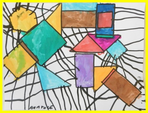 Ce sont des bombes de créativité et il n'y a pas besoin de leur faire contourner des formes géométriques qu'ils assemblent parce qu'on leur a demandé...Ils les font naturellement, ils les portent en eux comme toute humanité depuis toujours, les composent pour exprimer, rendre présent, faire naître la vie par sa représentation, feuille de papier qui devient le miroir du monde qui l'entoure.