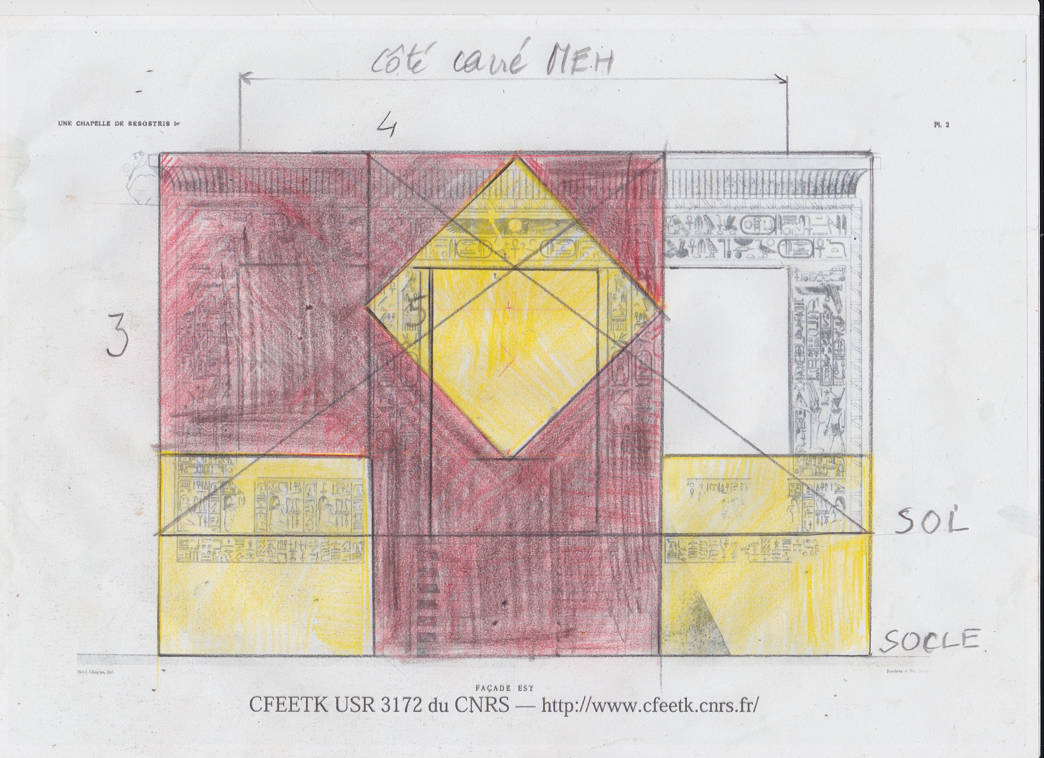 Ce qui rejoint les dalles du toit puisqu'elles forment un carré de 7m07 pour une diagonale de 10m, soit 5 Aawy...5 fois le module jaune, mais aussi 5 fois les deux portes battantes de la petite Chapelle de Sésostris, portes qui parcourent ensemble un arc de 6 meh nessou