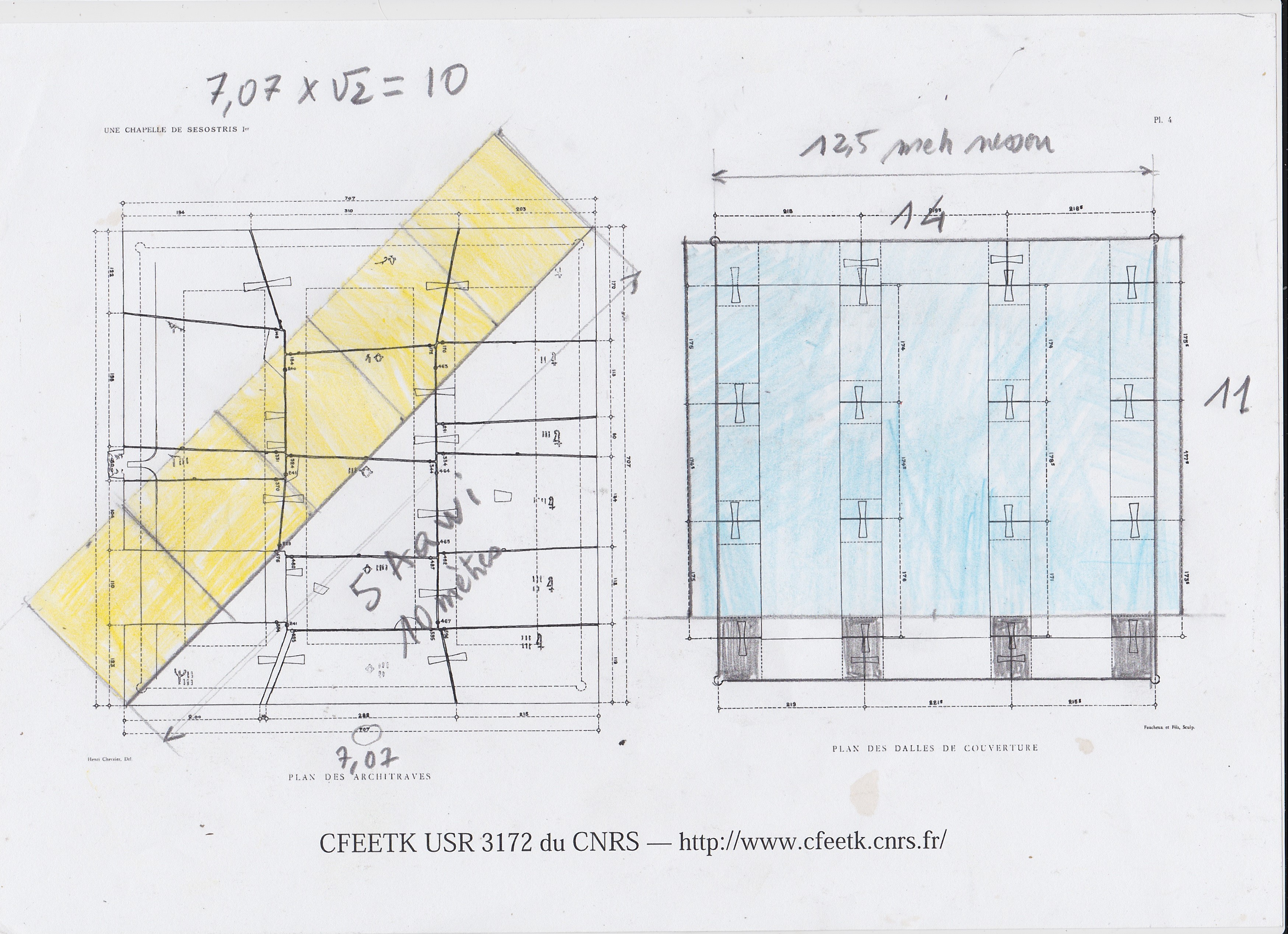 Le toit en pierre est un carré parfait de 7.07 mètres et vaut donc cinq côtés de carré jaune, 1 Aawi ( 3 meh nessou 5 shesep 3 djébâ soit très proche de 2 de nos mètres)...