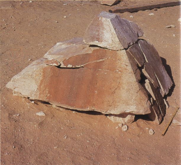 Ce pyramidion a été remonté une première fois, et sa pente n'avait rien à voir avec celle de "la Rouge"; la littérature de l'époque a donc évoqué la possibilité que ce soit celui de Khoufou.