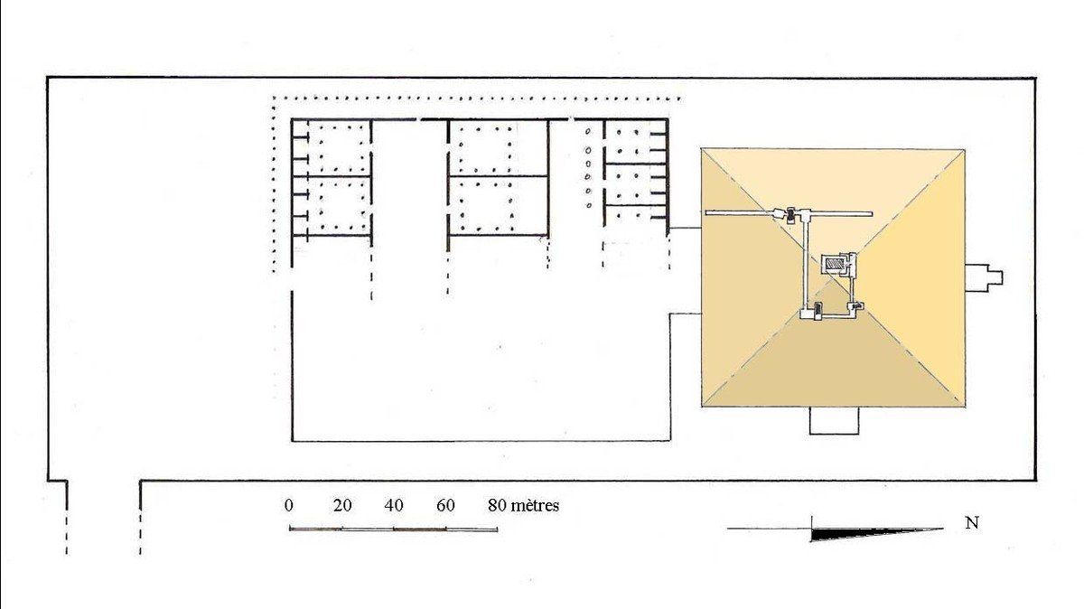 D'autre part je n'arrive pas à retrouver les dimensions de la pyramide (105 mètres) et la longueur de l'enceinte (385 mètres) avec l'échelle indiquée, ni même en me calquant sur la dimension d'un de ces éléments. Bref pas de plans fiables, encore une fois ...