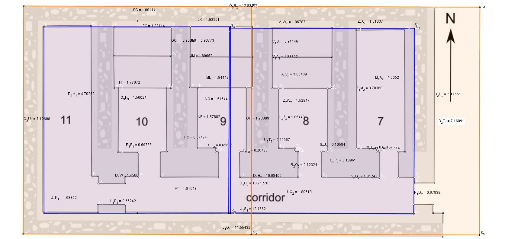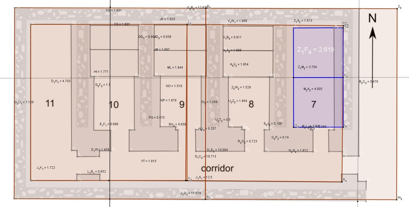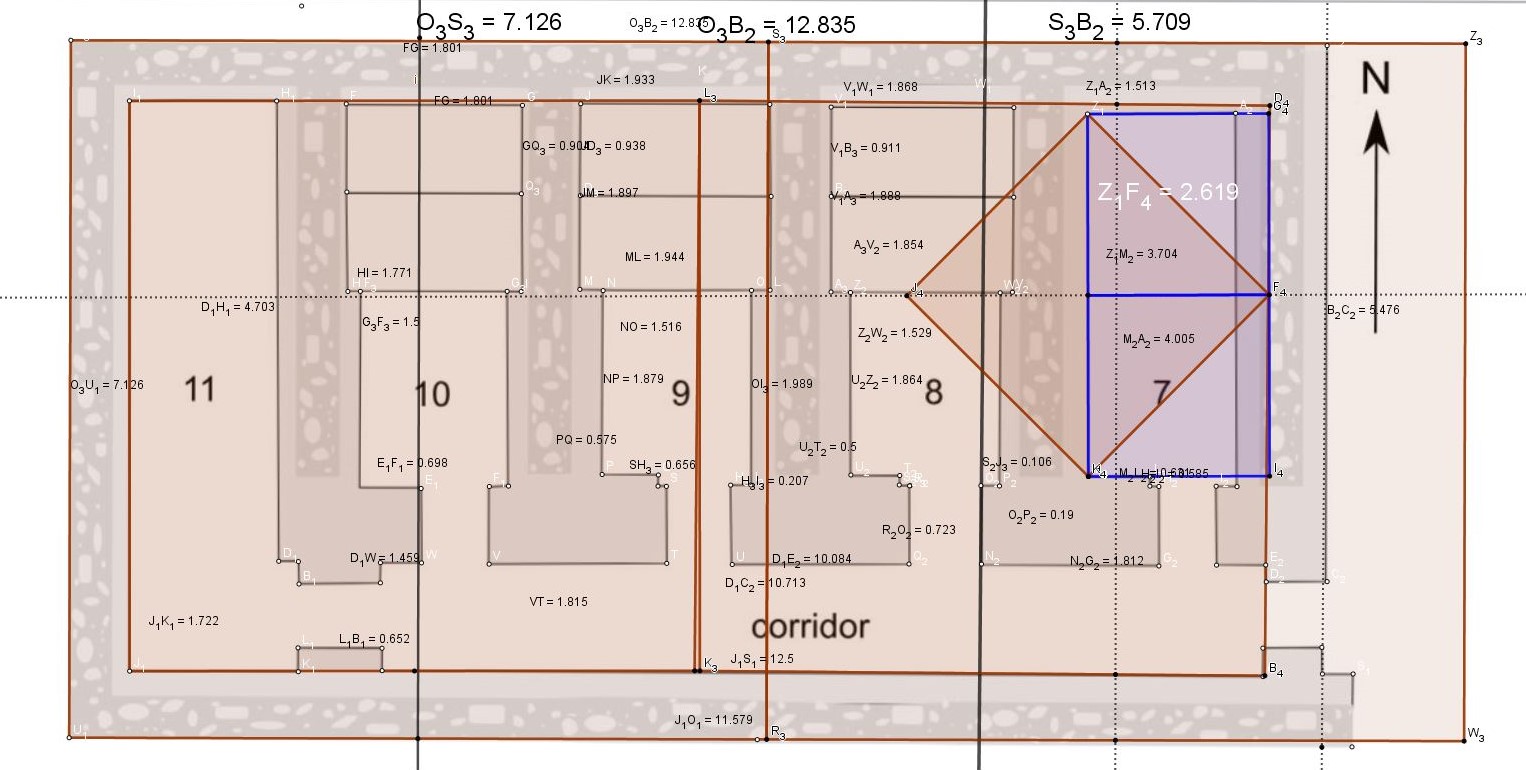 Observons maintenant la pièce à droite, marqué 7, cette pièce où nous avons tracé avec son mur intérieur OUEST un double carré.