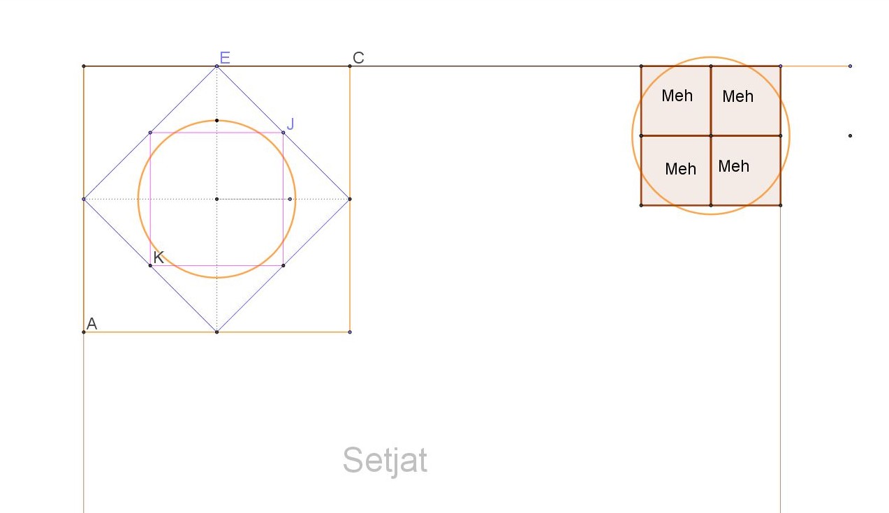 De ces 4 carrés surface nous avons en orange tracé le cercle qui a la même aire que ces 4 carrés Meh et que nous avons reportés dans le carré en haut à gauche.