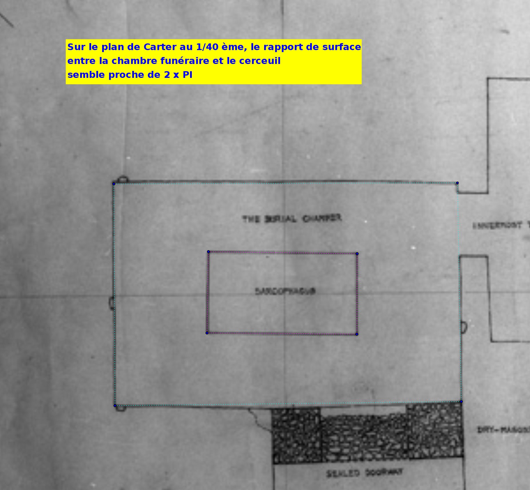Le tracé sur les proportions fait au dessus est toujours valable, sauf les mesures qui doivent être réduites par le facteur 1.0948, car ce ne serait l'implantation au sol qui ferait 2.74/1.477, mais la corniche, donc la plus grande dimension externe, Carter n'ayant fait la coupe qu'au autres enveloppes, pour la dernière la cinquième( sans compter le voile ) est laissée non coupée, simplement le couvercle enlevé, on voit donc le cardre le plus extrème être la corniche...Ouf!
