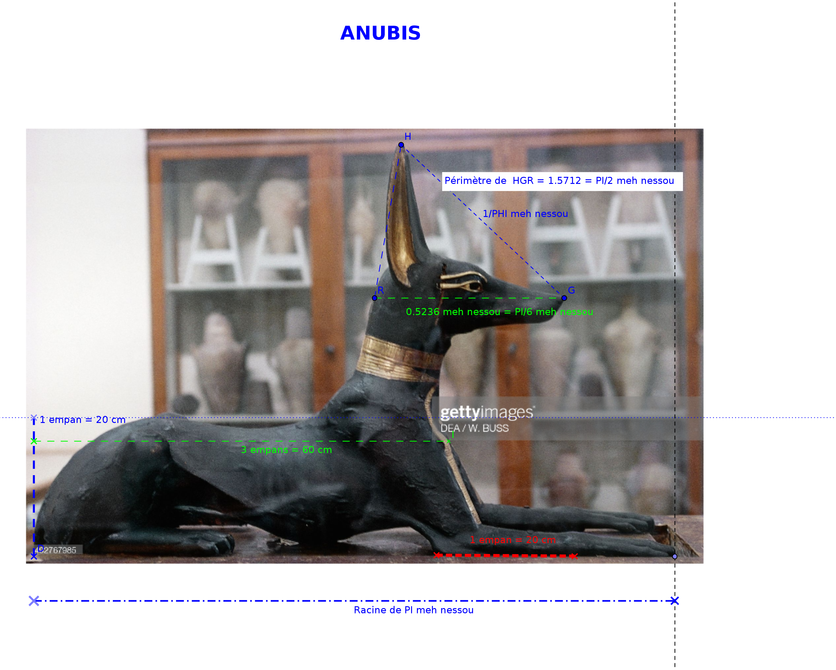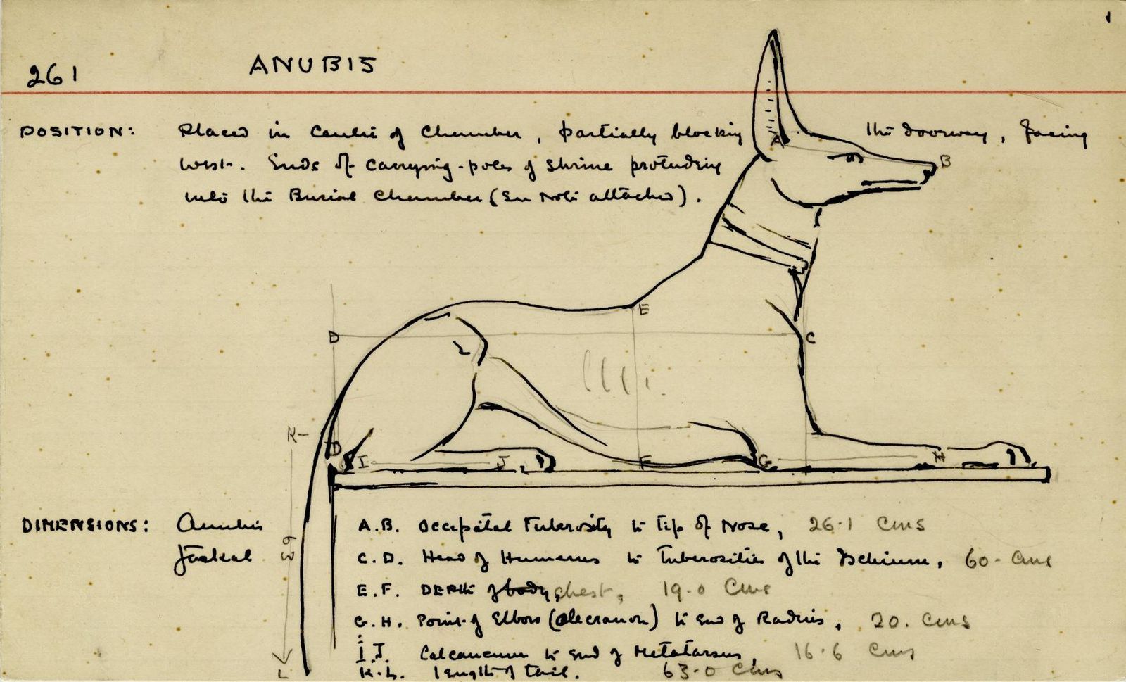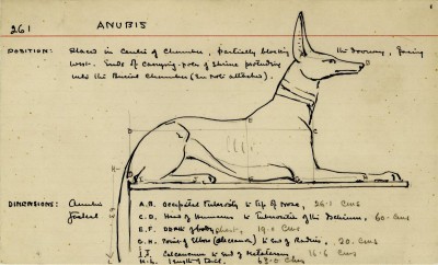 Description de la liste des mains: Figurine couchée du chacal Anubis, sur un sanctuaire, avec traîneau et bâtons de transport