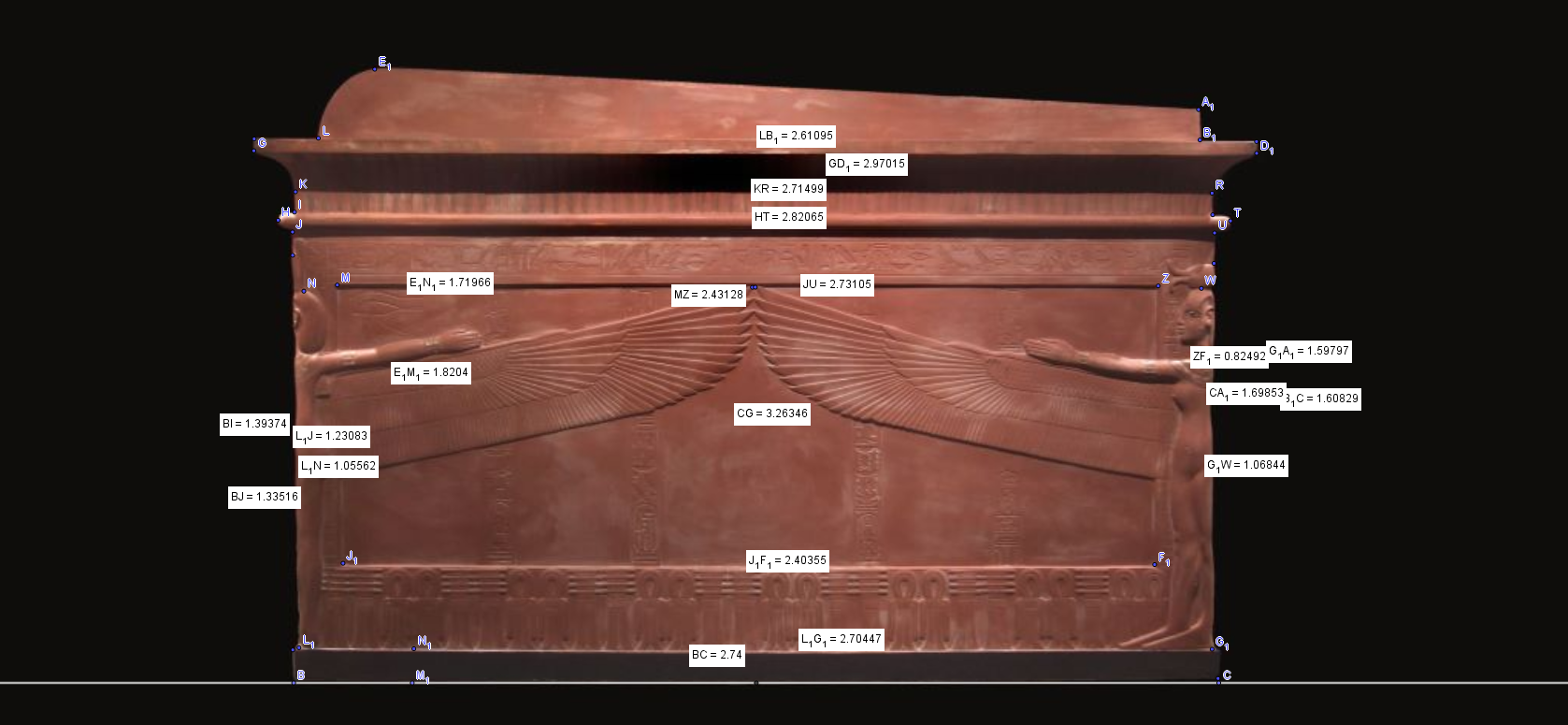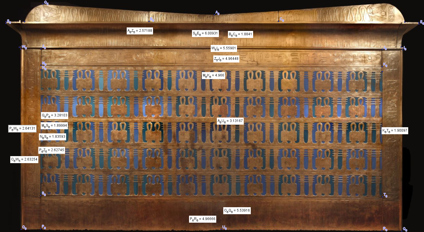J'ai vérifié et revérifié, si la photo respecte les proportions, avec un 2.74 m/1.47m ( seule mesure donnée par Carter) de prise au sol de la cinquième enveloppe, la première en mesure maximum a donc bien un 6.009m sur la photo et 6.03 m en calculant directement sur les dessin de Carter.