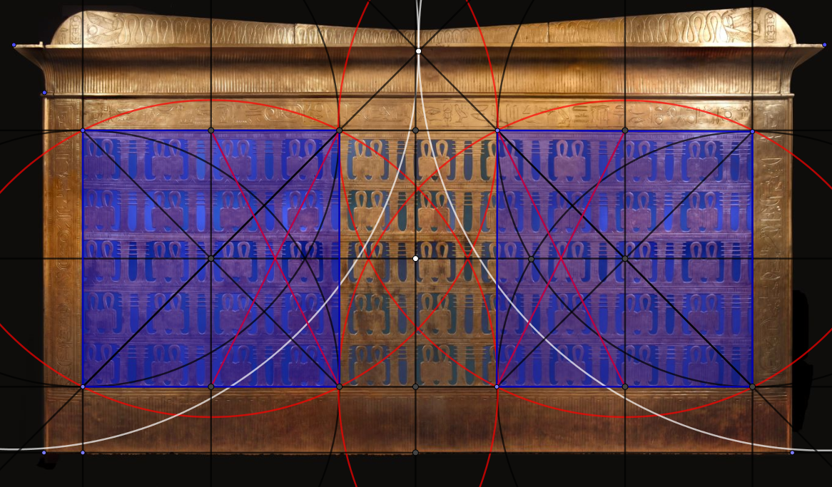 Mais nous avons aussi avec 5.55 mètres, largeur du coffre en bas, 3 fois(3 meh nessou 3 shesep et 3 djébâ), 3 fois 99 djébâ qui a permis la triangulation rationnelle du carré pour obtenir, bien mieux qu'avec une équerre, les angles droit pour la menuiserie...