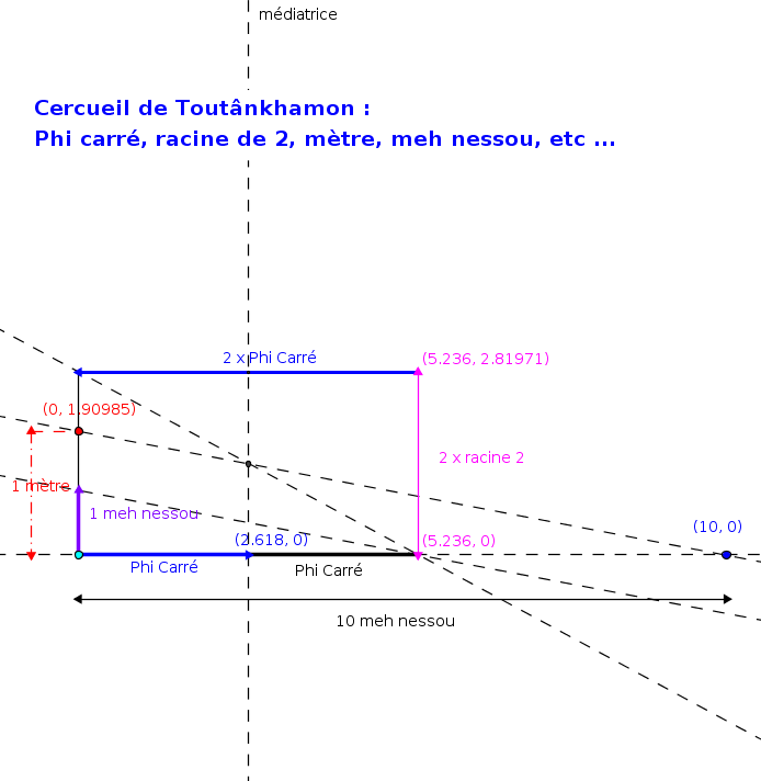 Dans la construction ci-dessus du cercueil de Toutânkhamon, si on part du mètre, c'est à dire du point (0, 1/0.5236) pour tracer la droite rejoignant le point (10,0), on arrive à la construction par Thalès du point 5.236 meh nessou, sans arrondi, ce qui fait 2.74156 ... mètres. Ce sera exactement 2 fois 2.618, mais cela ne fait pas 2 Phi carré exactement. En effet phi carré mesure 2.618033 etc .. et non juste 2.618.