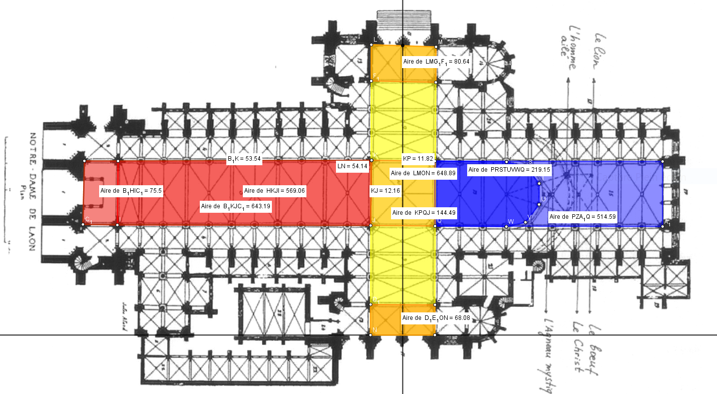 Et de sacrées surprises en cherchant le carré surface correspondant à la somme Nef-Transept-Choeur, mais aussi le cercle de même surface et de même périmétrie, mais encore le carré et le cercle de même surface et de même périmétrie de chaque partie de cette Trinité.