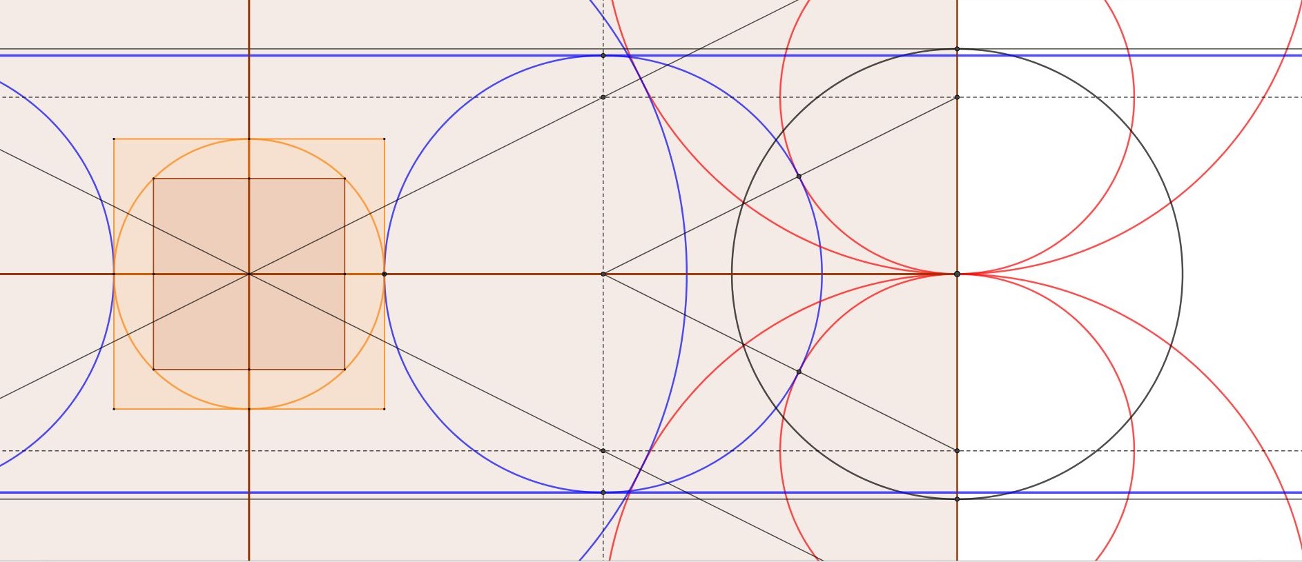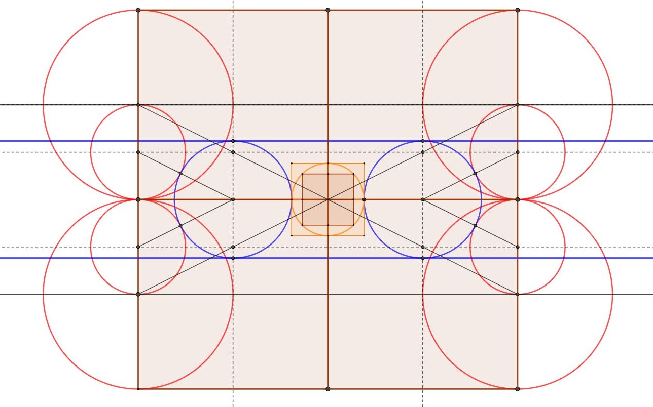 Revenons à notre carré et cercle orange à la croisée du transept qui sont tangents à nos cercles bleus...