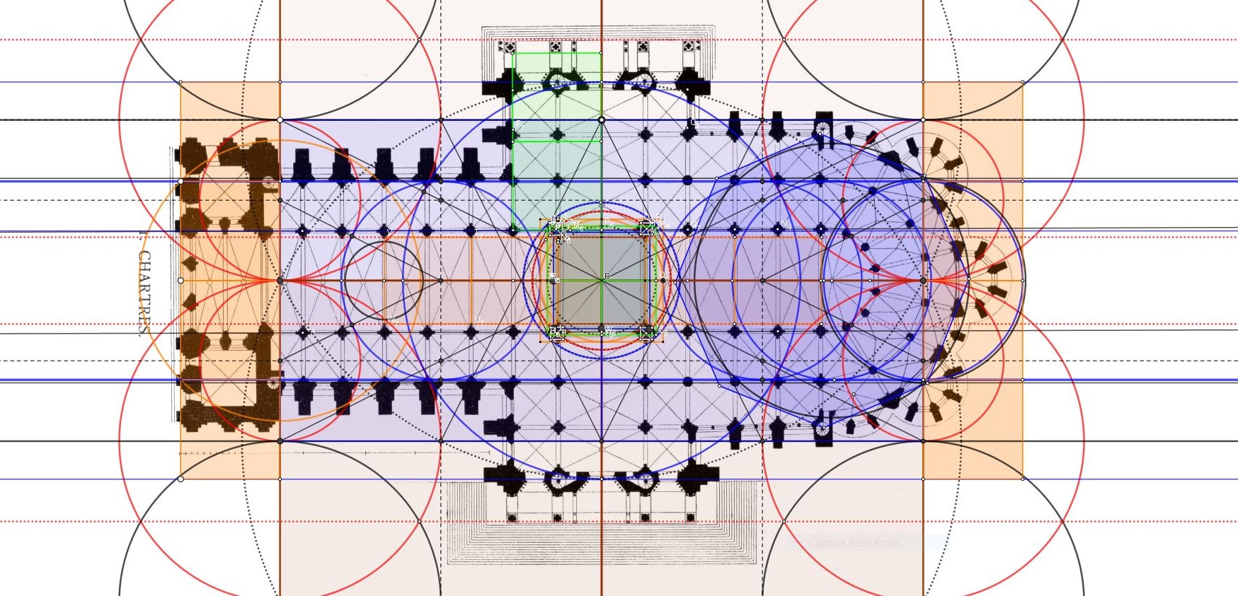 Le grand cercle bleu central, son diamètre détermine les portes des transepts Nord et Sud.