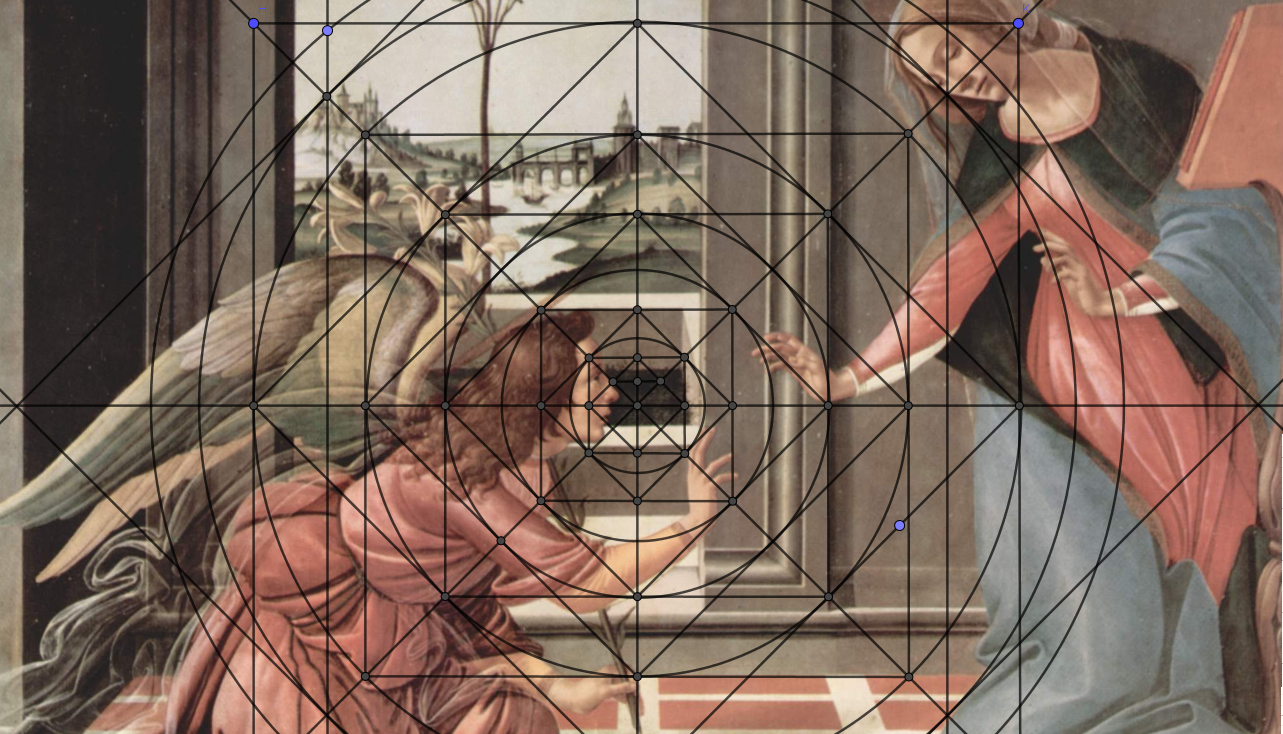 Une Annonciation de Botticelli sur laquelle nous reproduisons les trois tables mais aussi les carrés de 1/2, 1/4,1/8, 1/16, 1/32, etc... dans le carré de quadrature circonférence avec la table ronde, trame exacte transposée de la Cène de Da Vinci à l'Annonciation de Botticelli qui lui est antérieur...