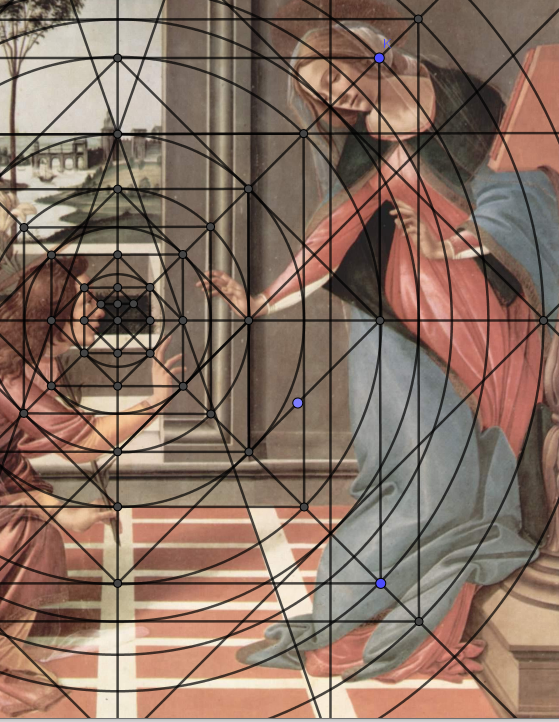 L'ange de l'annonciation, comme un caillou dans l'eau, induit toutes ces ondes circulaires en quadratures et en racine de 2 qui dessinent Marie.
