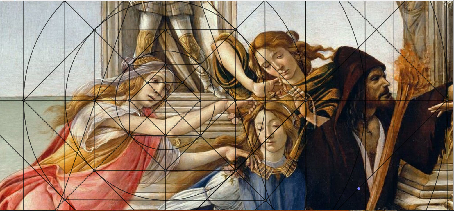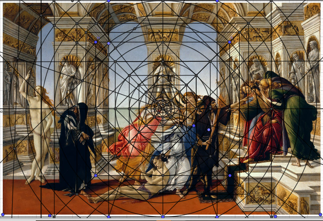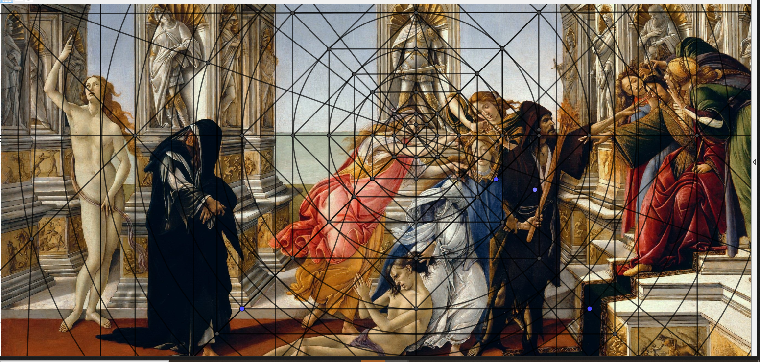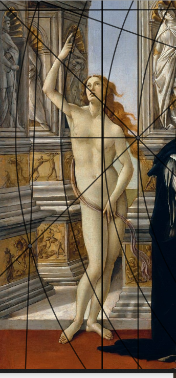 Un petit dernier pour la route mĂ©ditative de l'analyse d'une oeuvre, Calunnia Di Appel de notre Botticelli, contemporain de Da Vinci, et avec la mĂȘme grille utilisĂ©e sur l'annonciation. Nous verrons que l'ancien point de fuite sur l'horizon est ici lâĆil de la statue. Pour le reste toujours trois tables et il suffit de relire.
