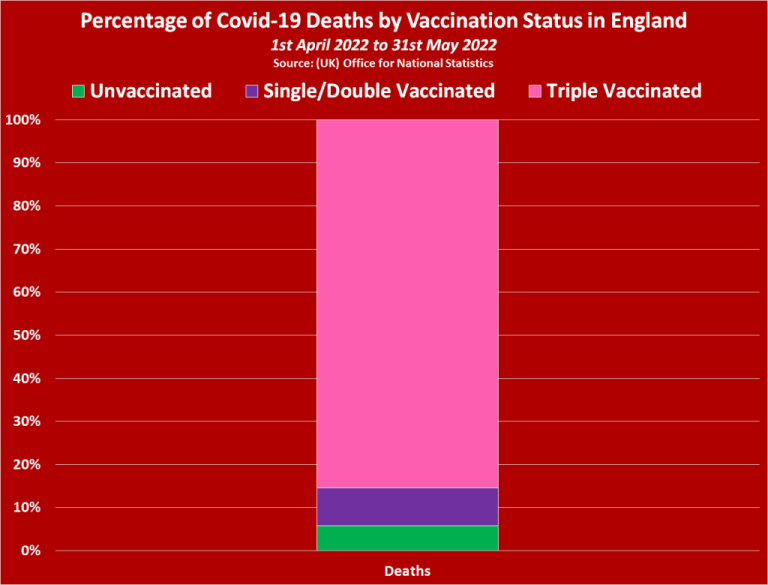 Les chiffres officiels publiés par le gouvernement britannique révèlent que la population entièrement/triplement vaccinée a représenté plus de 9 décès de Covid-19 sur 10 en Angleterre au cours de l'année écoulée, 91 % de tous les décès de Covid-19 depuis le début de 2022 et 94 % de tous les décès dus au Covid-19 depuis début avril 2022.