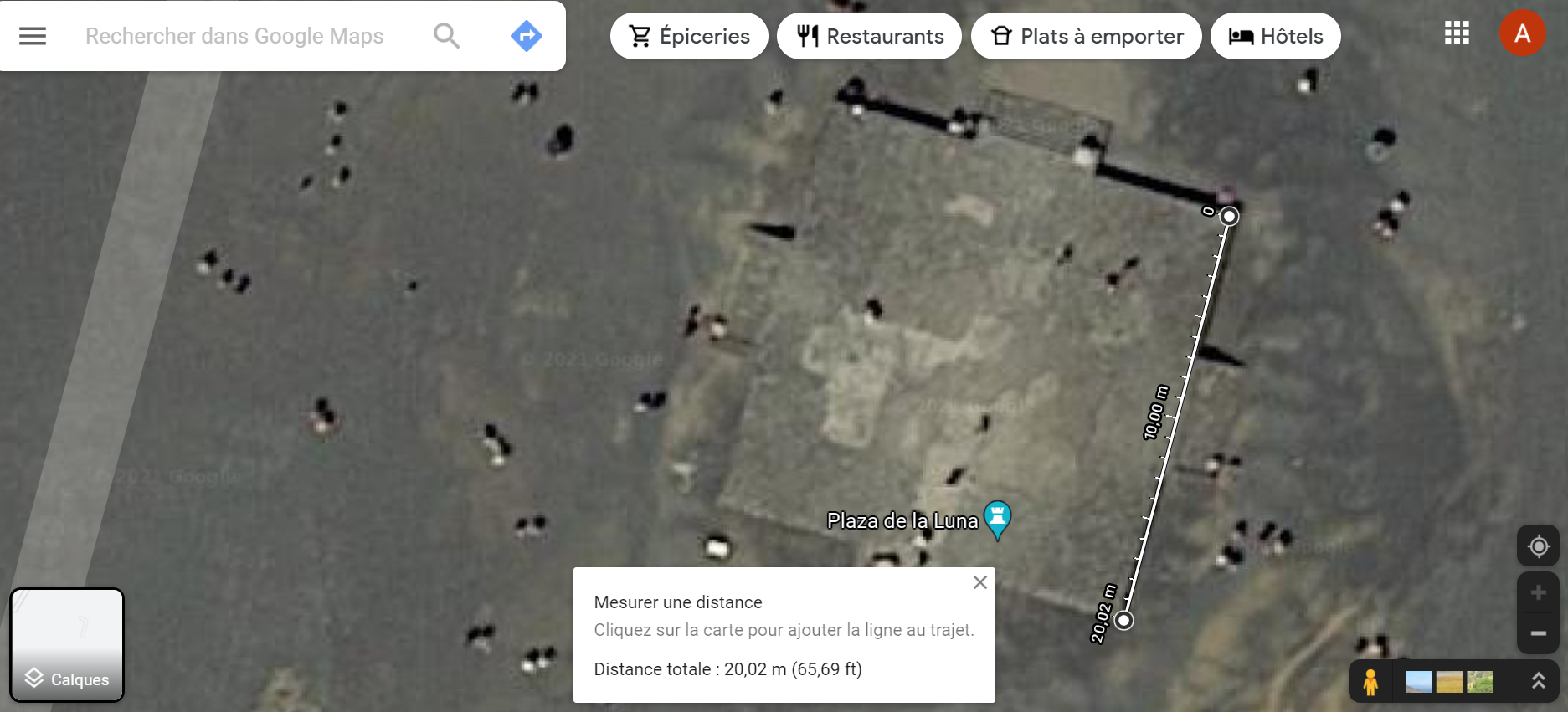 Pour patienter afin d'obtenir plus de précision pour les mesures de la Pyramide de la Lune, il est plus simple de mesurer les structures qui apparaissent plus nettes et bien détourées à proximité de cette pyramide..