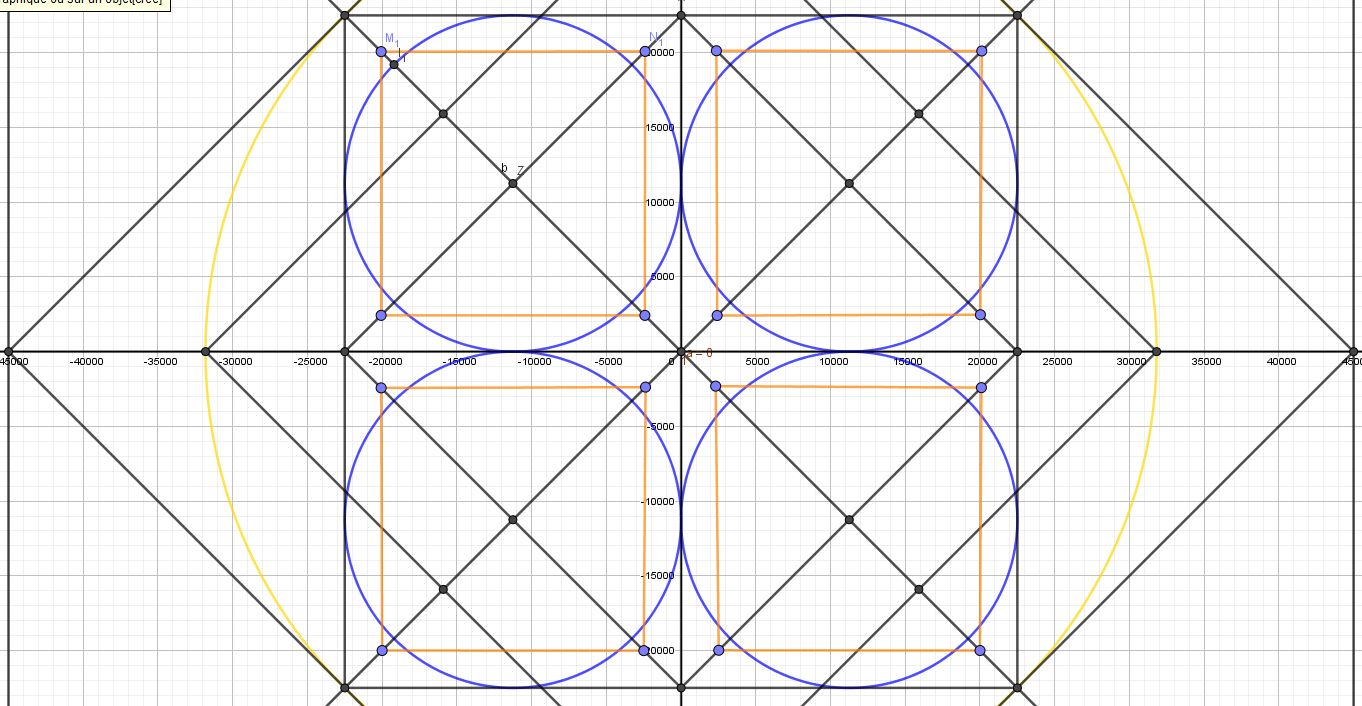 Par exemple le motif central de la fresque, eh bien sa largeur permet de l'inscrire dans un carré de cercle circonscrit de surface de 1.9191 meh nessou carrés !