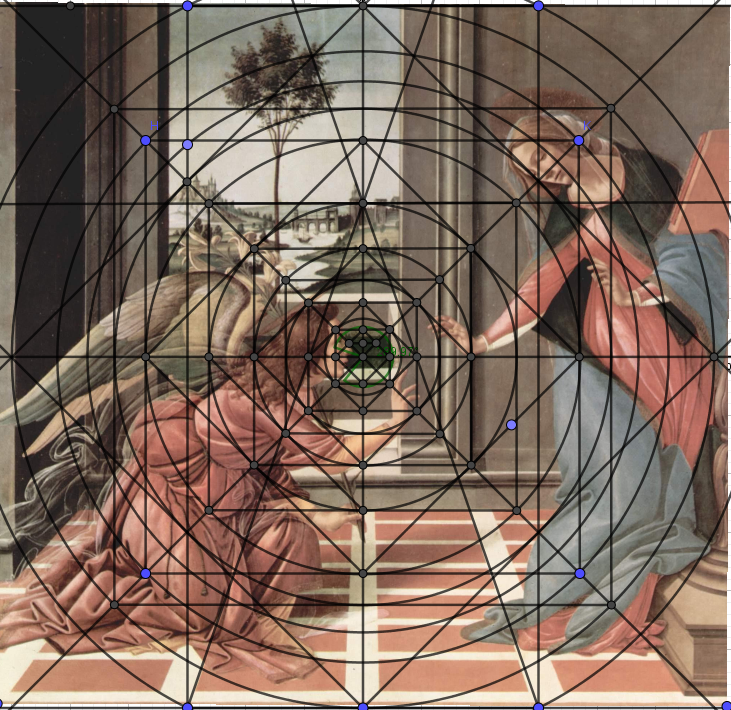 Une Annonciation de Botticelli sur laquelle nous reproduisons les trois tables mais aussi les carrés de 1/2, 1/4,1/8, 1/16, 1/32, etc... dans le carré de quadrature circonférence avec la table ronde, trame exacte transposée de la Cène de Da Vinci à l'Annonciation de Botticelli qui lui est antérieur...