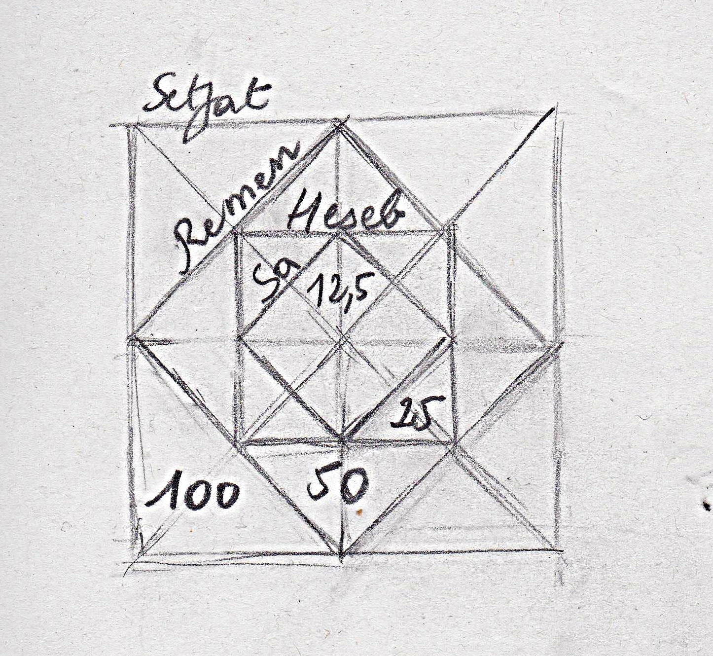 A croire que les anciens Égyptiens connaissaient la triangulation rationnelle du carré, puisque le Meh en forme carrée a 70 shesep de côté et sa diagonale 99.