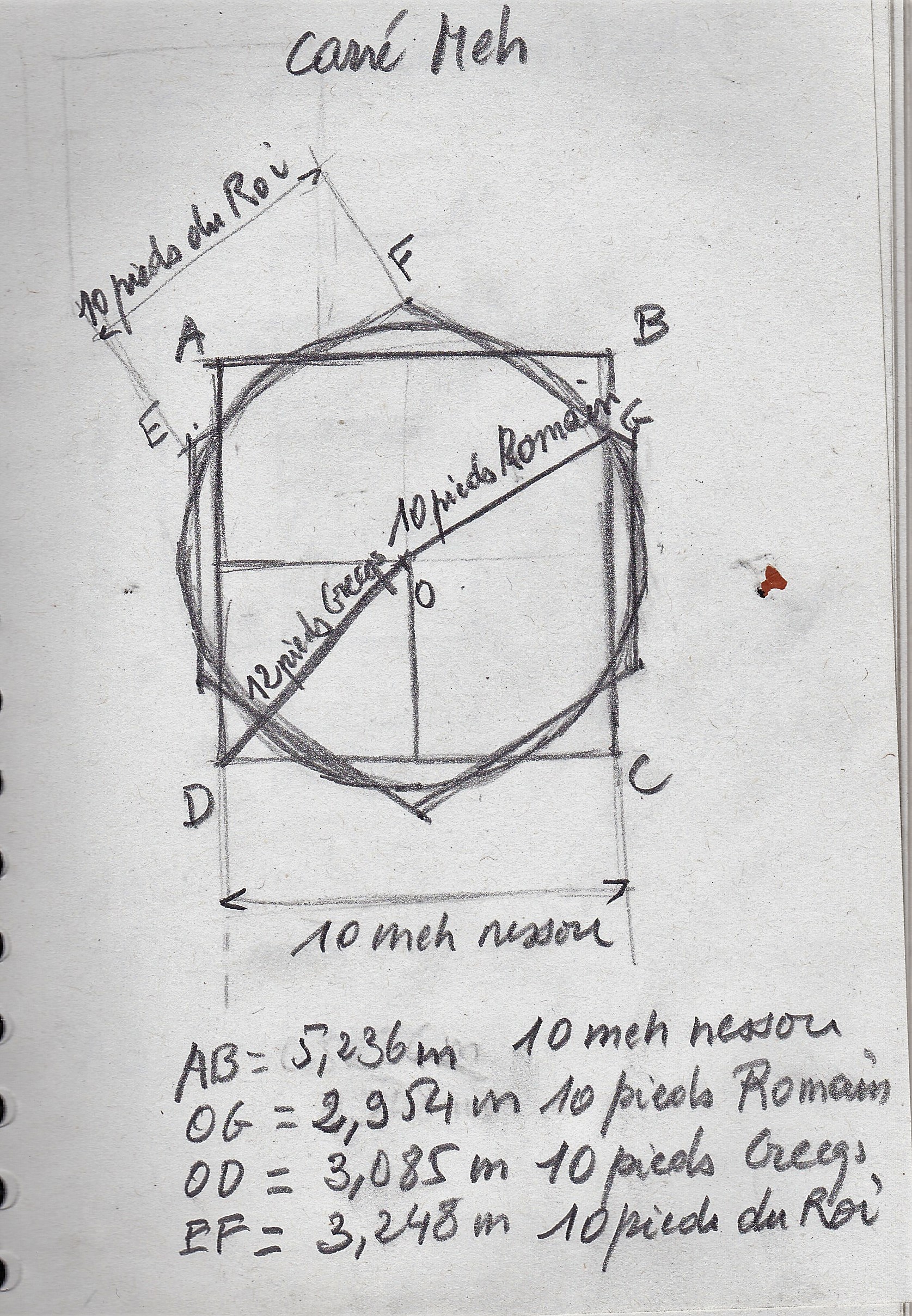 -Ce carré Meh a la même surface qu’un disque de rayon de 10 pieds romains( pied de 0.2954 mètres)