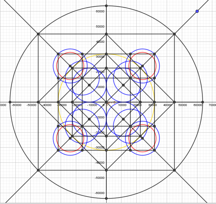 Ces carrés ont même surface que le cercle des tours qu'ils font naître, cercles rouges!