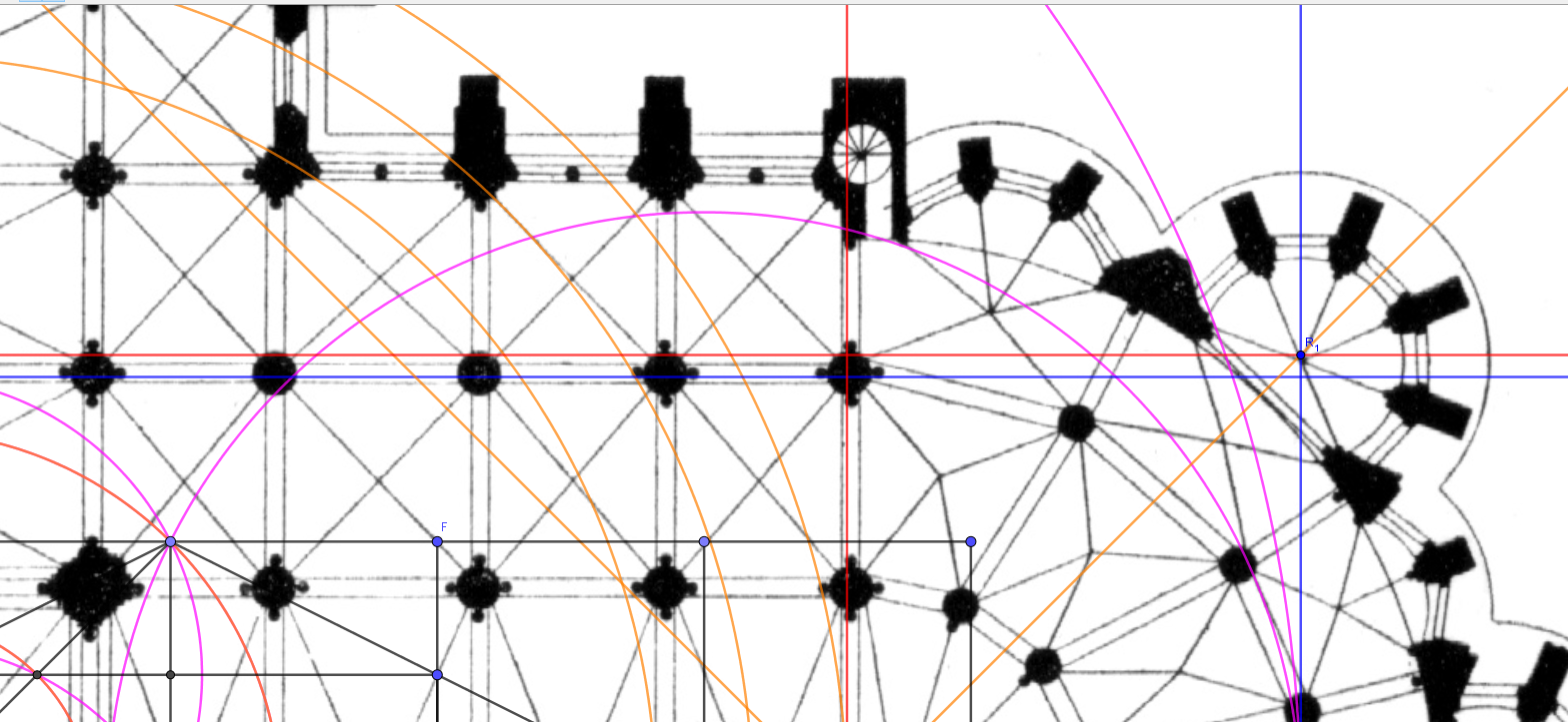Nous avons mis en évidence les travées, 5 cercles oranges ayant chacun un diamètre de 14.14 m et donc un rayon de 7.07 m, soit l'exacte moyenne des mesures des travées de la Cathédrale.