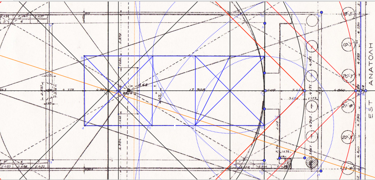 Le rectangle bleu est ici le Naos, explosé par la poudrière Turque, nous y reviendrons plus largement par la suite, mais nous ne pouvons résister au plaisir d'y faire émerger le rectangle de proportion un et Phi carré...ni d'ailleurs l'implantation au sol du socle d'Athéna, cette fois un rectangle 5/2, dont sa largeur de 2.614 m n'est rien d'autre que 5 meh nessou Égyptienne et la logueur le côté du carré de la Chapelle Blanche de Karnak en Egypte ( Tout à fait normal puisque 6 pieds de 0.3085 m s'élèvent à la brasse de 1.8512 m qui portée à 10 brasses ne sont autre que le côté d'un carré de surface Meh, mesure de surface de l'ancienne Égypte.)