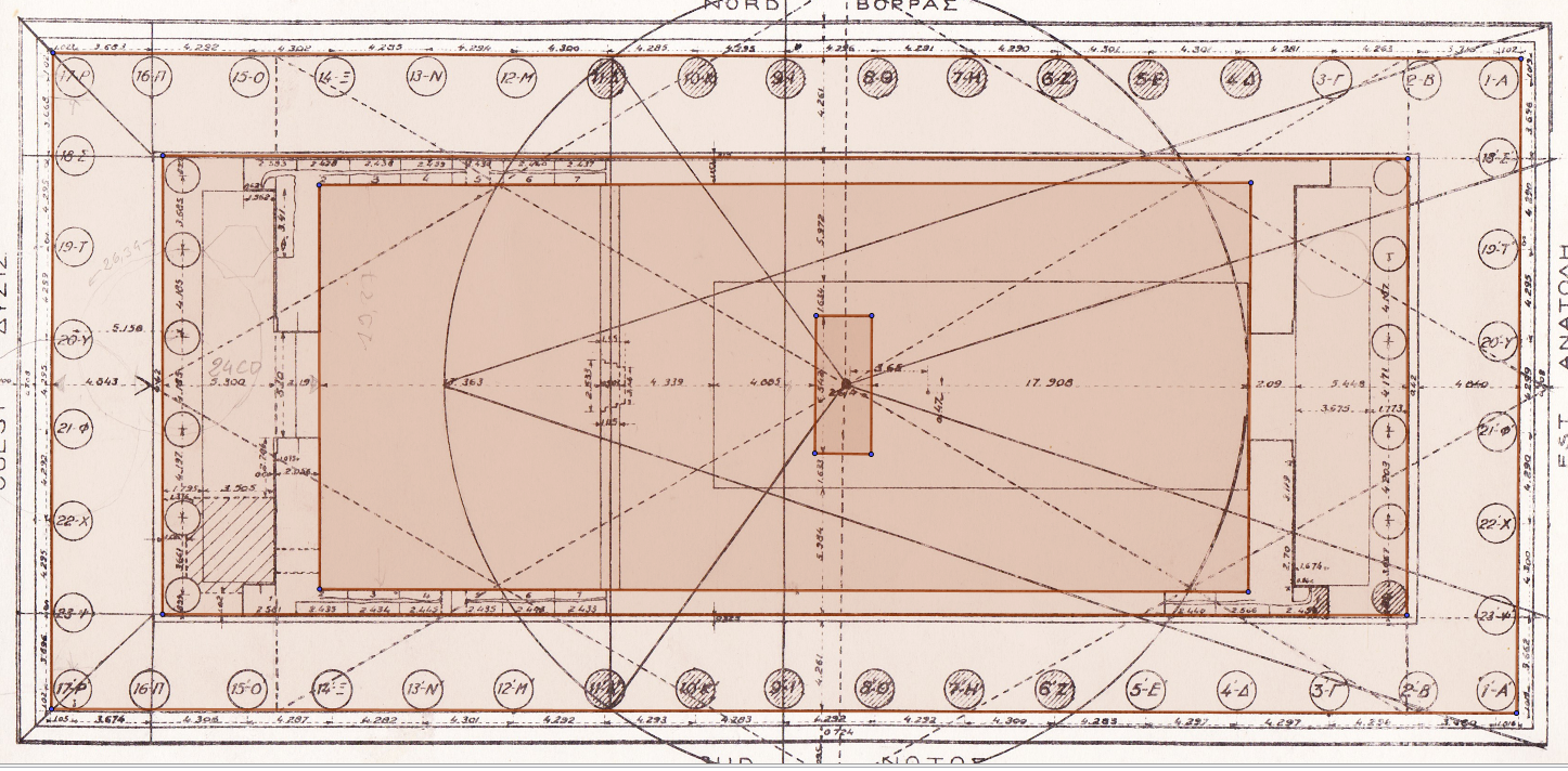 La diagonale de ce carré rouge éveille à nos yeux la totalité de l'espace intérieur, le Sekos plus le Pronaos et l'Opisthodome qui lui est semblable, à l' Est et à l'Ouest.
