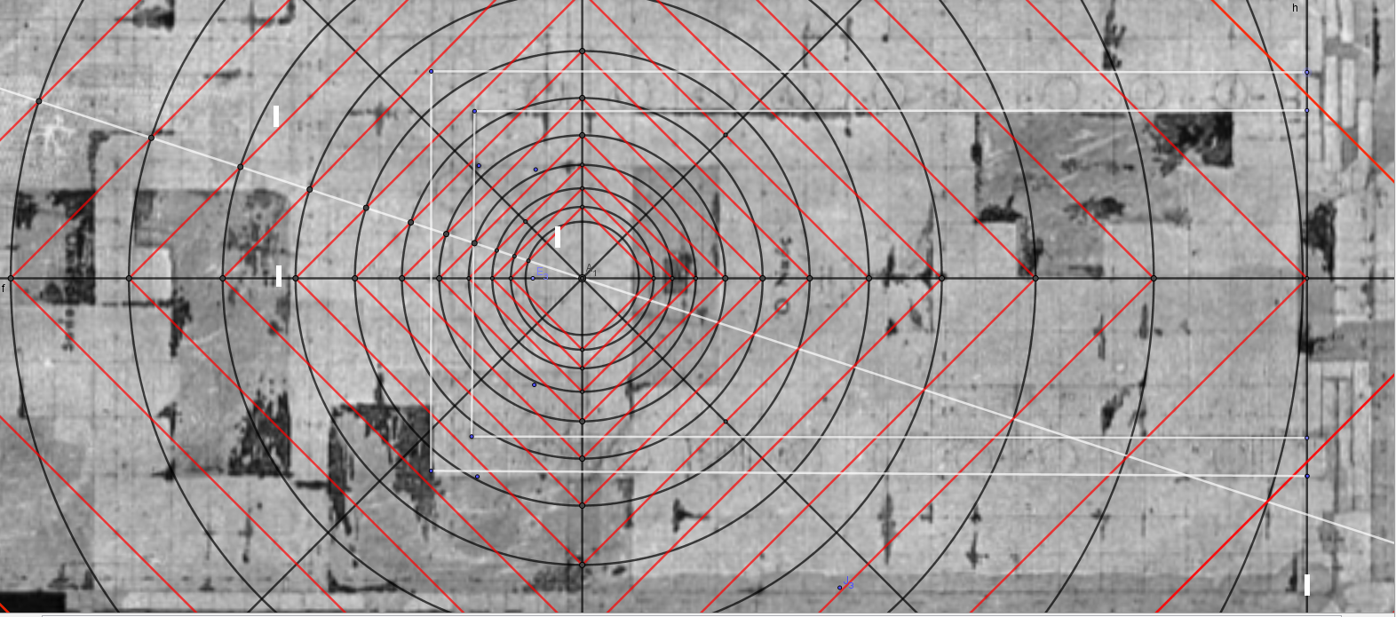 Sans détour, se reposant sur un très bon plan d'Orlando( Pour l'instant nous n'avons pas accés aux mesures qui ont été nécessaire pour la restauration qui aujourd'hui repose chaque pierre à sa place), sur lequel il reste les tracés d'Elisa Maillard( Les Carnets du nombre d'Or) dont je ne me sers pas ici, puisque je pars d'une toute autre démarche qui est celle des périmétries et surfaces des cercles et carrés.