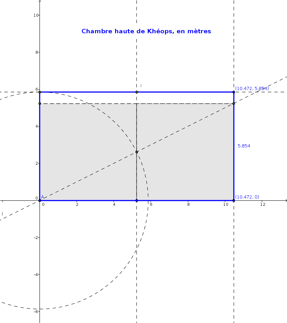 Et bien il se trouve que sa hauteur peut se construire non pas seulement à partir de la demi diagonale de sa base, mais aussi par le point de rencontre de deux cercles de rayon 10 x PI/4 mètres. Ce qui impliquerait bien sûr de connaître non seulement PI/4 avec PI= 3.1416, mais également le périmètre terrestre, gravé depuis dans le granite et soigneusement caché sous des millions de tonnes de calcaire ...