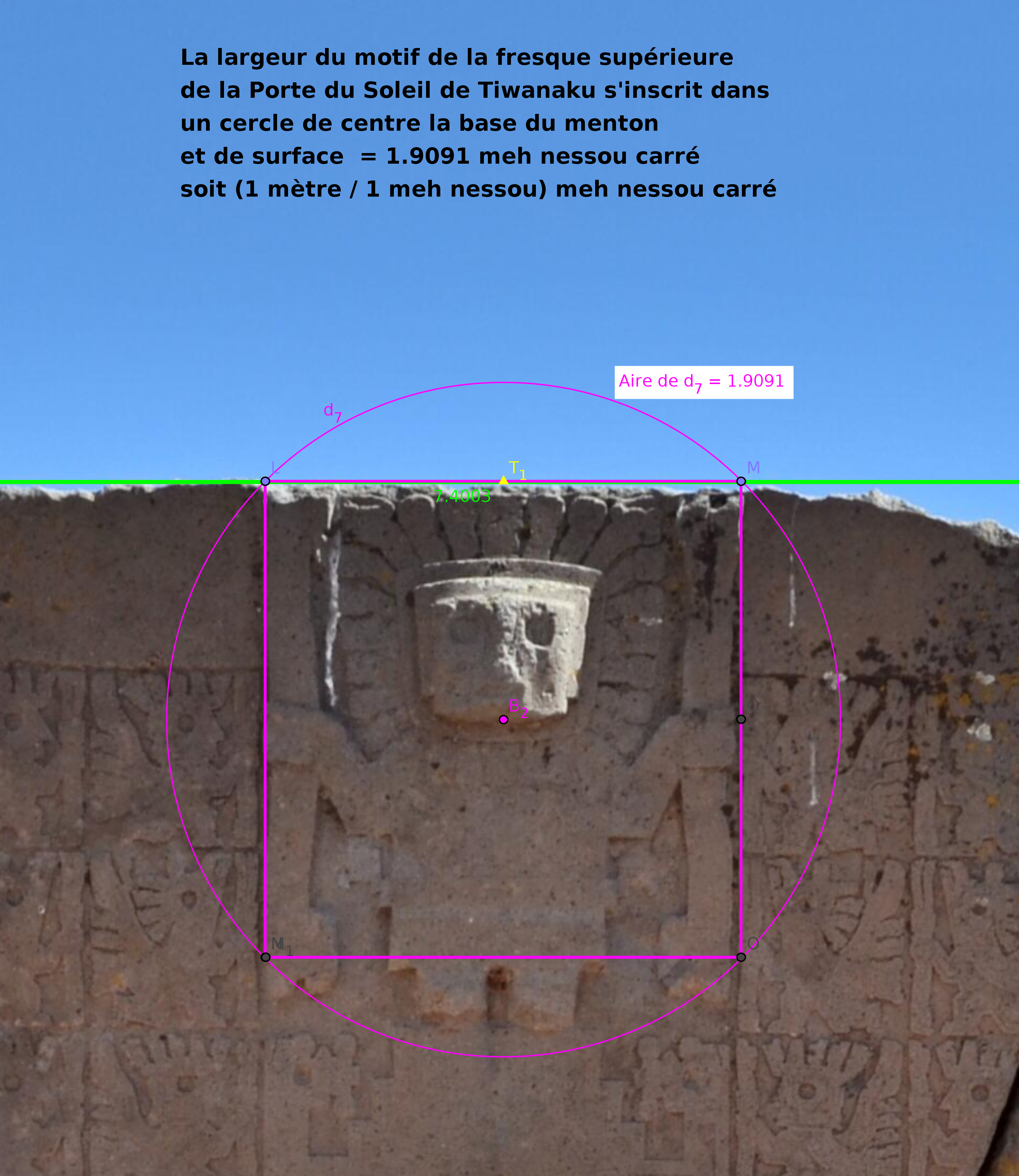 Par exemple le motif central de la fresque, eh bien sa largeur permet de l'inscrire dans un carré de cercle circonscrit de surface de 1.9191 meh nessou carrés !