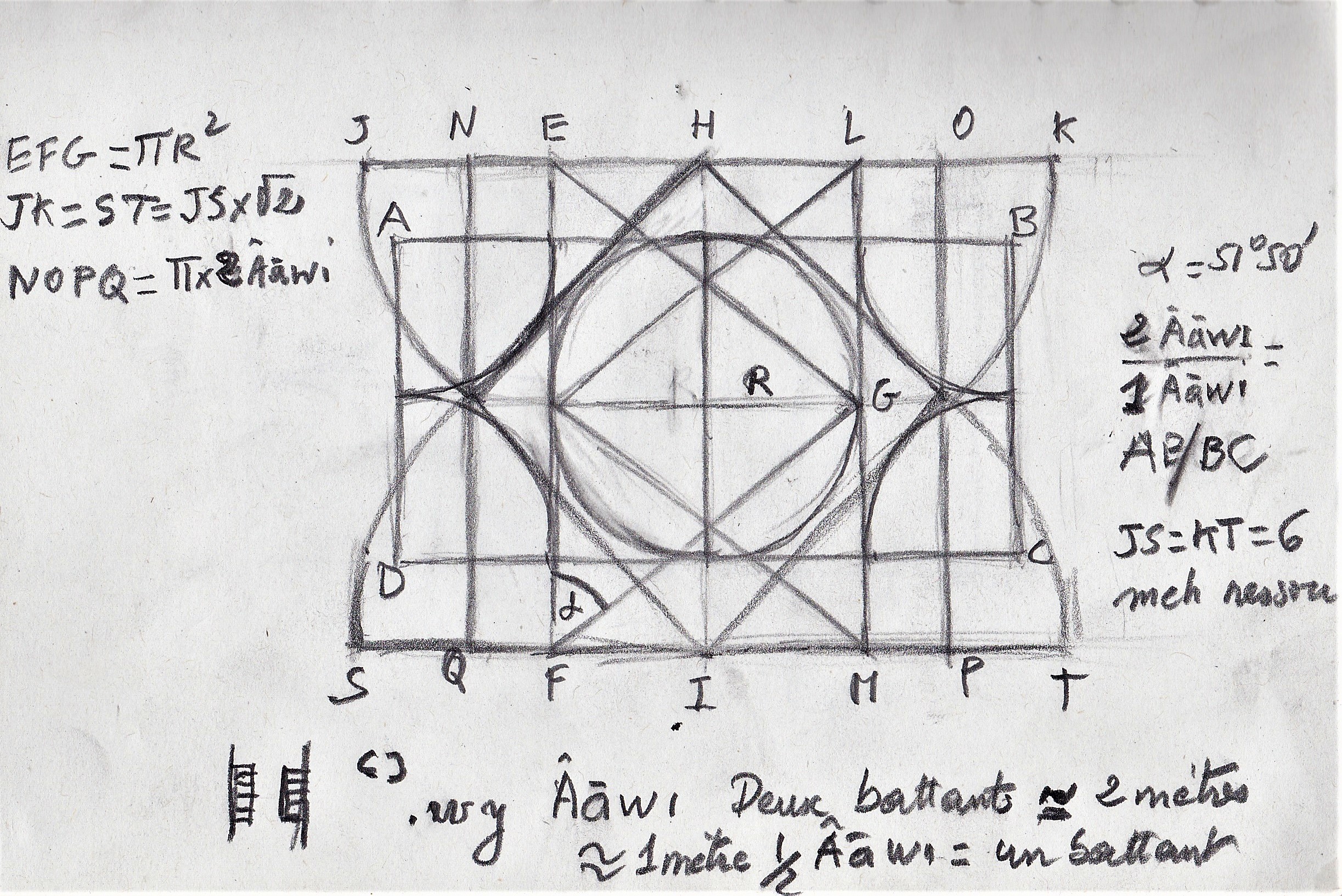 Pour l'extérieur, un carré de 6 meh nessou, sa diagonale rabattue donne le rectangle de longueur 6 Meh nessou fois racine de 2 et ce carré dans le rectangle délimite l'emplacement du logement des portes.