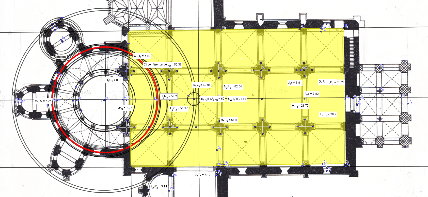 Je ne cite pas le cercle qui passent par les clefs de voutes du choeur, il ne fait pas partie du plan au sol, mais du plan au ciel !