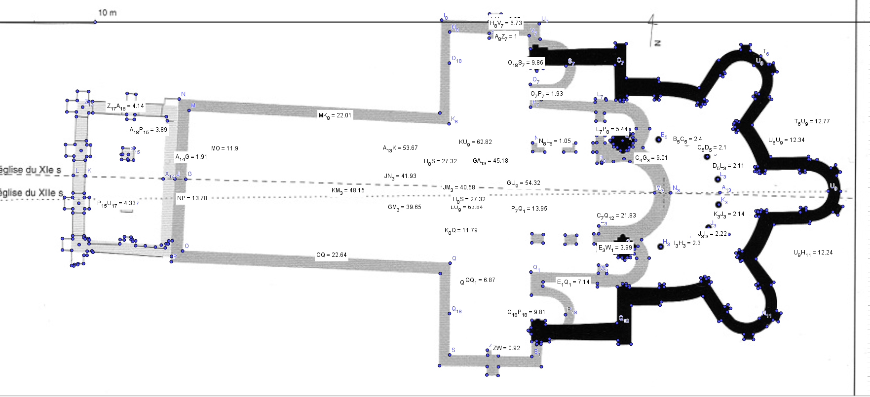 Je le paramètre sur Geogebra, du fond de la verrière de la chapelle du choeur jusqu'à l'entrée de la porte, 44.88 mètres?!?!?