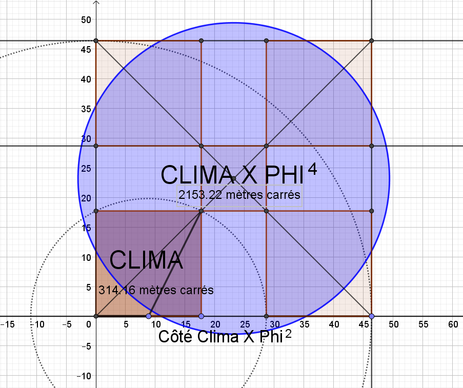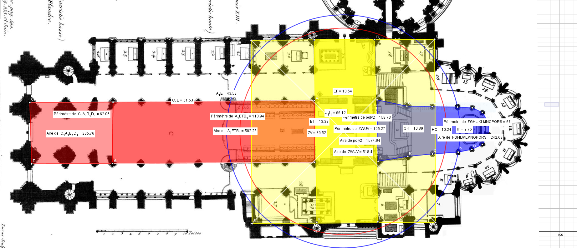 A titre indicatif, j'y ai ajouté le cercle en rouge de même surface qui fait bien évidemment 50 empans du moyen âge fois la racine de 5, ajouté aussi son cercle en bleu de même périmétrie !