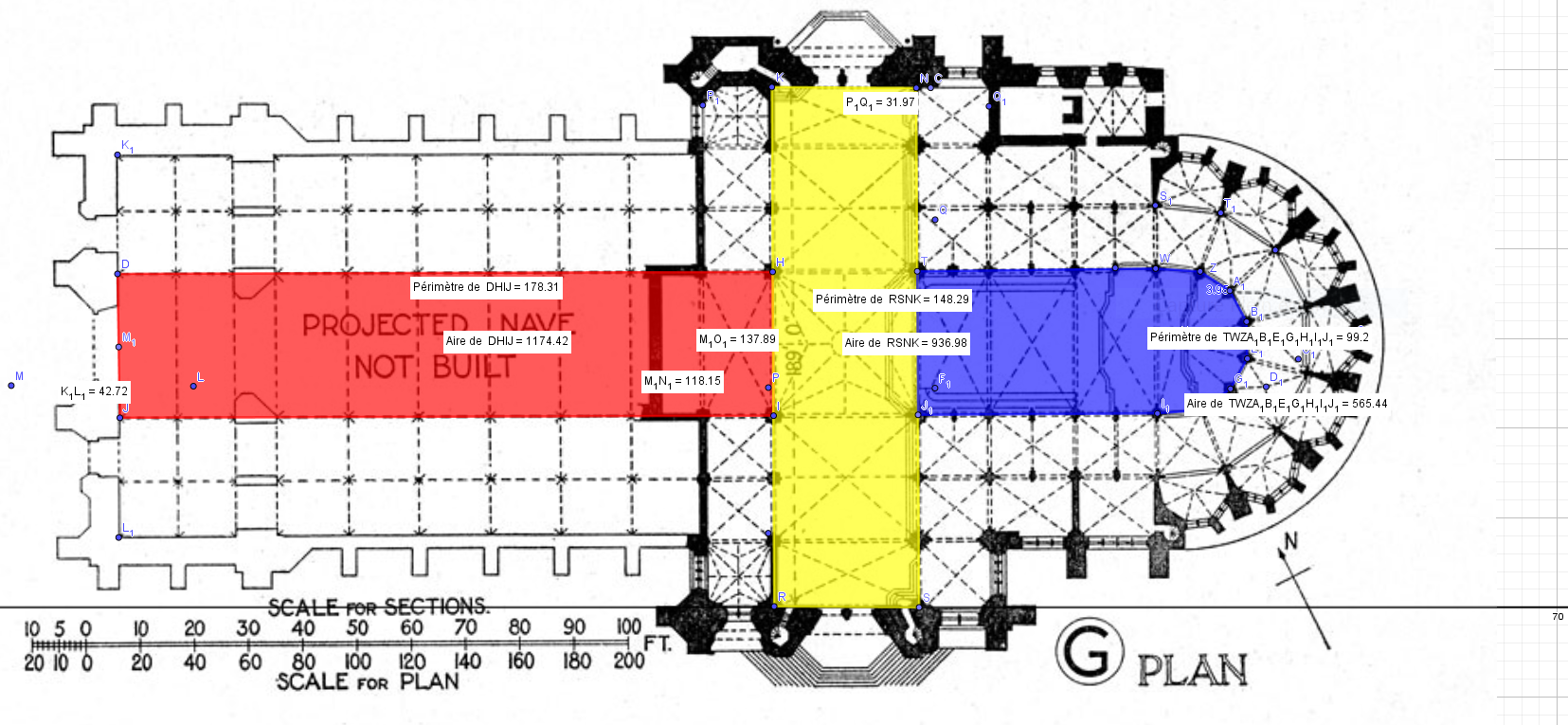 Et de sacrées surprises en cherchant le carré surface correspondant à la somme Nef-Transept-Choeur, mais aussi le cercle de même surface et de même périmétrie, mais encore le carré et le cercle de même surface et de même périmétrie de chaque partie de cette Trinité.